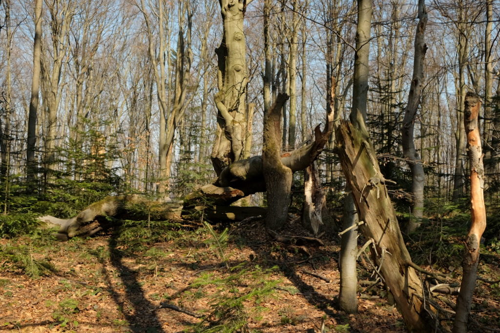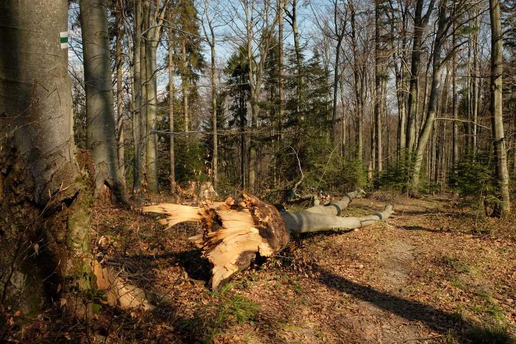 Ostry Dział to niewielki grzbiet górski odchodzący od wału Magury Małastowskiej na północny-zachód od szczytu Magury. Po osiągnięciu kulminacji Ostrego Działu skręcam w lewo i krótkim, grzbietowym odcinkiem idę w kierunki południowo-wschodnim. Na odcinku tym widać jakie szkody w drzewostanie poczynione zostały w ciągu ostatnich kilku lat. Leży dużo wiatrołomów zarówno bukowych jak i jodłowych. To skutki ostatnich suchych i coraz gorętszych sezonów letnich jak i mocnych, jesiennych wichur, które z coraz większym impetem łamią lub wyrywają z korzeniami drzewa. Południowo-zachodni stok Ostrego Działu wręcz ogołocony jest z drzew. Z drugiej strony leśnej ścieżki stoją wysokie buki i jodły ale widać po nich, że są słabe i długo tak nie postoją. Pnie mają popękane i narażone są na mocne powiewy wiatru ze strony, z której drzew brakuje. Z grzbietu Ostrego Działu skręcam lekko na południe i zaczyna się strome podejście na szczyt Magury Małastowskiej.