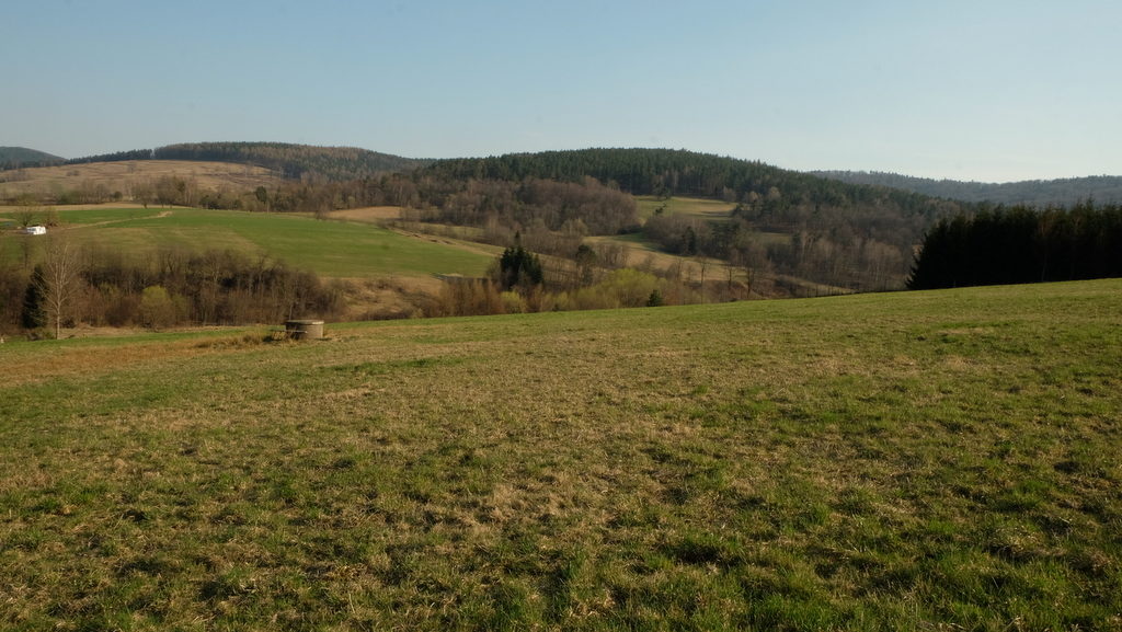 Podchodząc na przełęcz Owczary oglądam się do tyłu by spojrzeć na piękne widoki: Od południa widać wał Magury Małastowskiej z Wierchem przechodzący w kierunku zachodnim w Sołtysią Górę. Dalej, w kierunku północnym, z za stoków Sołtysiej Góry wyłania się Bartnia Góra a w głębi za nią Maślana Góra. Bliżej w kierunku wschodnim widoczny wał Obycza przechodzący w Brusy. Przede mną jeszcze krótkie podejście szutrówką na Przełęcz Owczarską, z której schodzi ona w następną dolinę – Dolinę Małastówki.