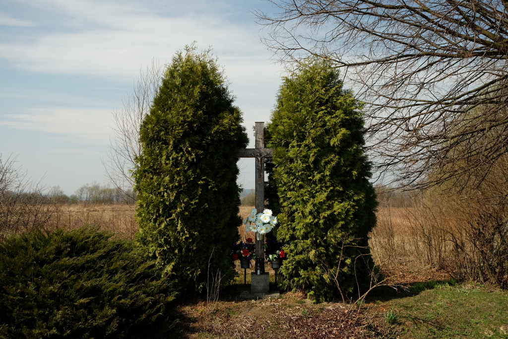 Brzyście to niewielka miejscowość i szybko przez nią przejeżdżam. Po chwili stromym podjazdem wjeżdżam w niewielki las i po minięciu go wyjeżdżam na otwarty, widokowy teren. Po prawej stronie drogi drewniany krzyż otoczony wysokimi tujami. Kawałek dalej, przy rozstaju gruntowych dróg, kolejny drewniany wysoki krzyż wystający ponad wysokie żywotniki. Ładny stąd otwiera się widok na Pogórze Jasielskie i Pasmo Magury Wątkowskiej Beskidu Niskiego.