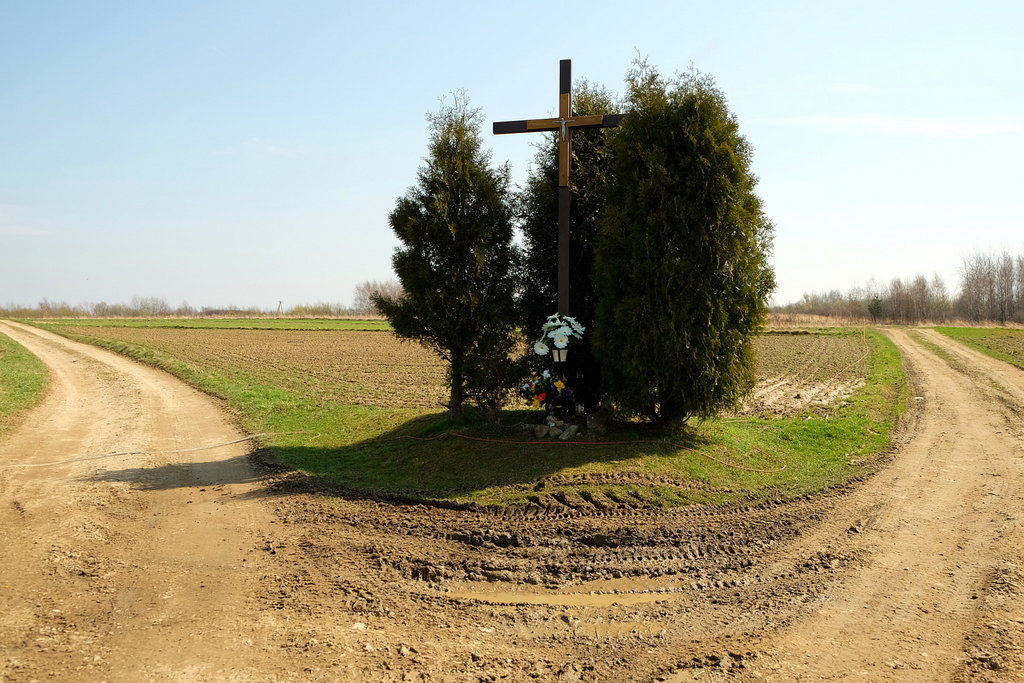 Z miejsca tego rozciągają się bardzo ładne widoki na okolicę. Podobnie z drogi Folusz – Jasło, którą właśnie będę dalej jechał dalej. Po lewej ręce w obniżeniu dolinki potoku Bednakra, pod wałem Cieklinki ulokowały się dwie wioski: Wola Cieklińska i Cieklin. Tym razem je omijam (będą opisane podczas innej wizyty) i jadę przez 3 km drogą w kierunku Dębowca. Po ok. 2 km skręt w lewo do Cieklina, a kawałek dalej skręcając w prawo można dojechać do kolejnego cmentarza z I Wojny Światowej. Jest to cmentarz Nr 12 – Cieklin (Józefów.) Projektował go niemiecki porucznik, inżynier budowlany Johann Jäger. Także i jego nie będę teraz odwiedzał, byłem przy nim i opis będzie przy okazji innego wpisu. Mijam murowana kapliczkę i przy samotnym przydrożnym krzyżu, przed widoczną ścianą lasu w Józefowie, skręcam w lewo, w polną dróżkę.