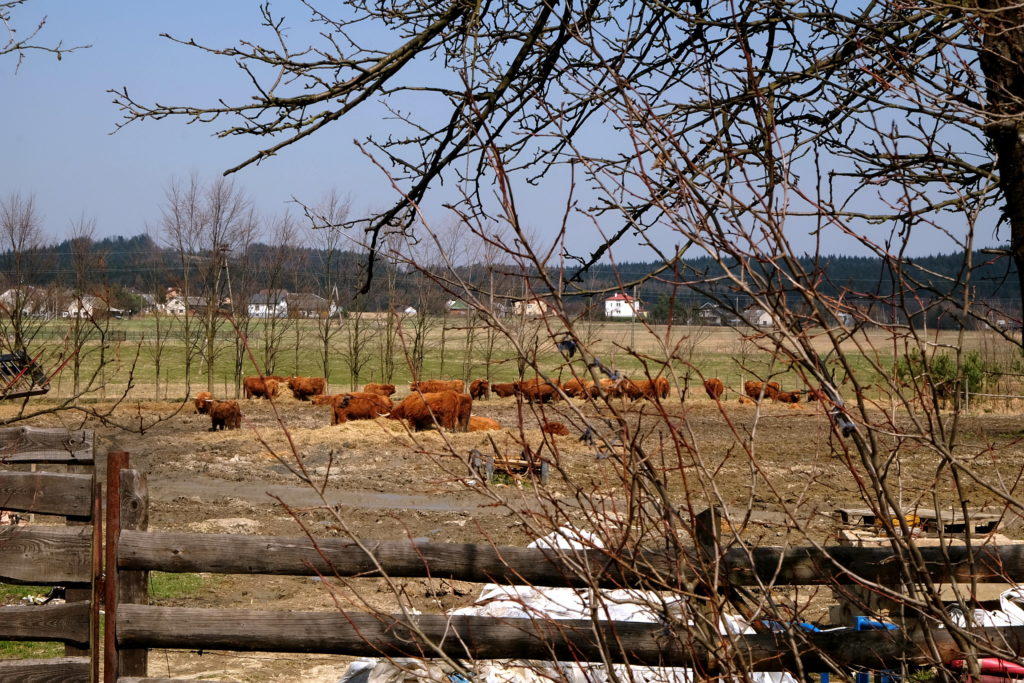 Po minięciu małego, modrzewiowego zagajnika wyjeżdżam na piękne, otwarte tereny. Jest tu taka malutka, zaciszna kotlinka i przyjemnie się tu jedzie. Wokół cisza i jest spokojnie, i po prostu ładnie. Po mojej lewej ręce niewidoczne stąd zabudowania Cieklina. Zatrzymuję się przy kolejnej murowanej kapliczce, skąd widać już pierwsze domy i drzewa owocowe Duląbki. Przejeżdżam przez wschodnią część tej wioski i na skrzyżowaniu dróg skręcam w szutrową drogę. Prowadzi tędy znakowany na czarno gminny szlak rowerowy.