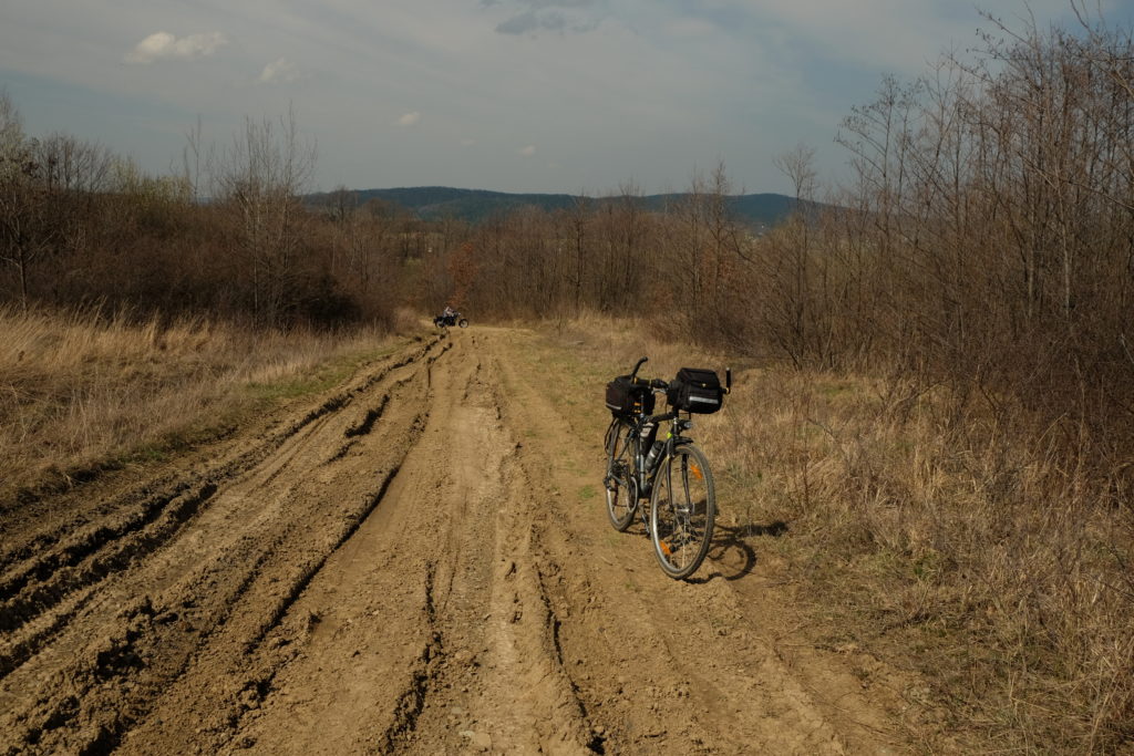 Szutrową drogą zjeżdżam z przełęczy. Wkrótce zmienia się nawierzchnia drogi – z szutrowej przechodzi w betonowe, popękane już płyty, po których bardzo źle się zjeżdża… Przed Bednarką skręcam w prawo i gruntową dróżką jadę północnym skrajem wsi prawie do jej końca.