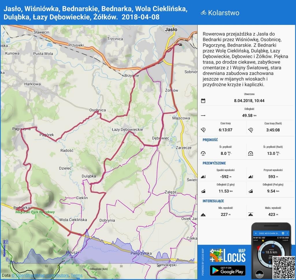Wiosenna przejażdżka rowerowa przez południowo-zachodnią część Pogórza Jasielskiego. Początek w Jaśle skąd przez Niegłowice, Brzyście nad Ropą, Wiśniówki, Osobnicę, Pagorzynę i przez Przełęcz Bednarskie do Bednarki (położonej już na skraju Beskidu Niskiego). Z Bednarki przez Wolę Cieklińską, Sieniawę, Duląbkę, Łazy Dębowieckie, Dębowiec, Majscową i Żółków do Jasła. Przyjemna trasa obfitująca w wiele ciekawych obiektów (zabytkowe cmentarze z Wielkiej Wojny, dużo ciekawych kapliczek i krzyży przydrożnych. Liczne jeszcze, zachowane w lepszym lub gorszym stanie, drewniane domy i budynki gospodarcze. Także tereny gdzie wydobywa się jeszcze, w śladowych ilościach, ropę naftową. Ponadto wszędzie dookoła budząca się do życia po zimie przyroda i przepiękne widoki na Beskid Niski oraz Pogórza Karpackie.