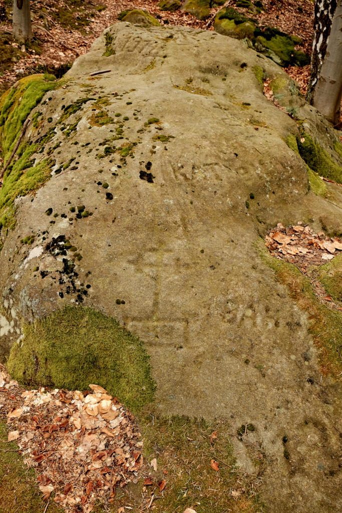 Mijamy duży pień pozostały po ściętym, starym buku wielopniowym (świadczącym, że było tu kiedyś pastwisko) po czym dostrzegamy grupę dość dużych skał. Jedna z nich jest właśnie tą szukaną przez nas. To na niej znajdują się tajemnicze, ponad stuletnie ryty naskalne.