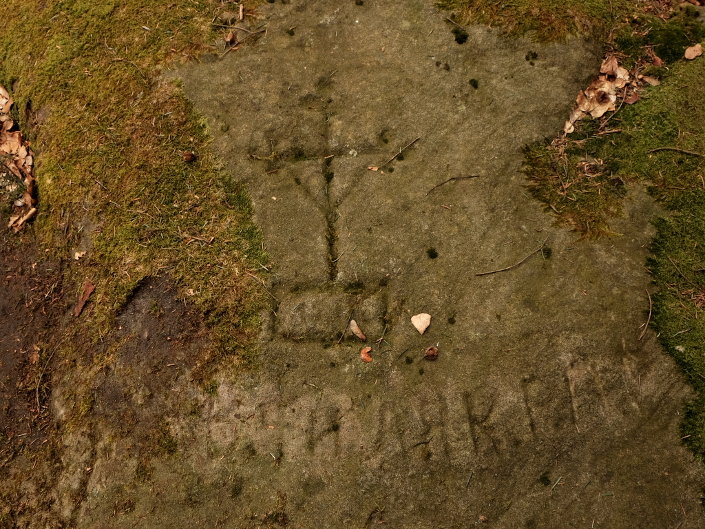 Na sąsiedniej skale leżącej na południowy zachód od głównego kamienia także znajdują się wyryte znaki. Te jednak wyrył ktoś nam bardziej współczesny, pewno inspirując się starymi rytami. Jest tam data “17 VI 79” i inicjały “T + S” – być może jakiejś pary, która tu spędzała czas???