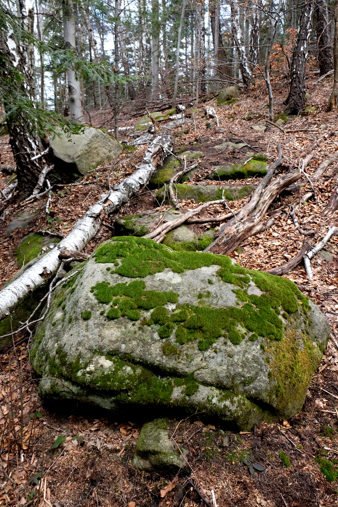 Tam, gdzie teren zaczyna wznosić się stromiej, opuszczamy leśną drogę idąc wprost w kierunku szczytu wypatrując pośród pni drzew skał i większych kamieni.