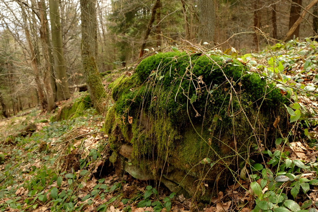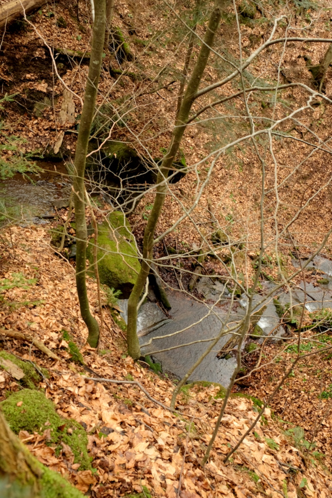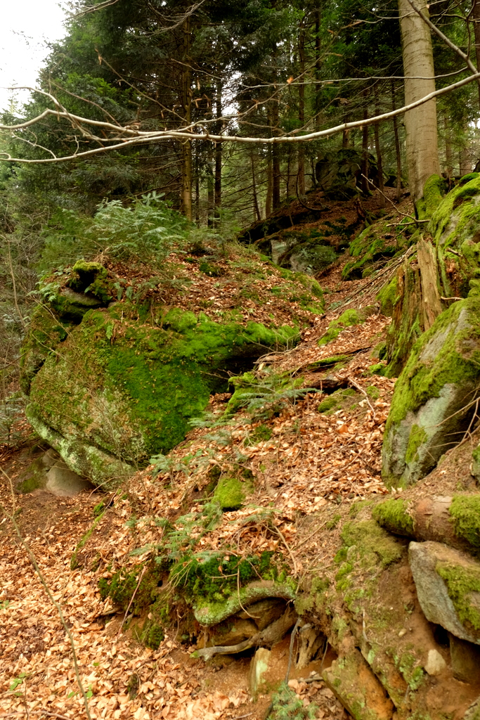 Skręcamy w nią, po czym droga ta skręca na północ ale my idziemy dalej wąską dróżką powyżej strumienia, prowadzącą na zachód. Podejście robi się coraz bardziej strome. Obok, z lewej strony, cały czas mamy głęboko wcięty i stromy jar potoku. Nieco wyżej, po prawej stronie mijamy sporo omszonych głazów o ciekawych i fantazyjnych kształtach i różnej wielkości.