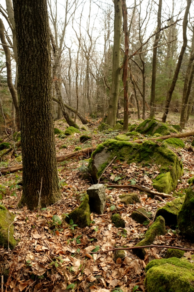 Po obejrzeniu skały z rytami kierujemy się na południowy wschód do kolejnej ciekawostki, która ma znajdować się gdzieś tutaj, na zachodnim stoku Piwanego. Nie znajdujemy jej od razu bo ma to być niewielki kamień i trudno go wypatrzyć wśród drzew. Wchodzimy więc na szczyt upstrzony mnóstwem omszonych kamieni. Dawniej stał tu trianguł ale dziś nie ma już po nim śladu – jest tylko granitowy słupek geodezyjny. Na południowy wschód od wierzchołka rozciąga się dość długi, wąski jar upstrzony sterczącymi głazami i wypełniony rumoszem skalnym. Rodzi się pytanie: Czy jest naturalny, czy może są tu pozostałości okopów?