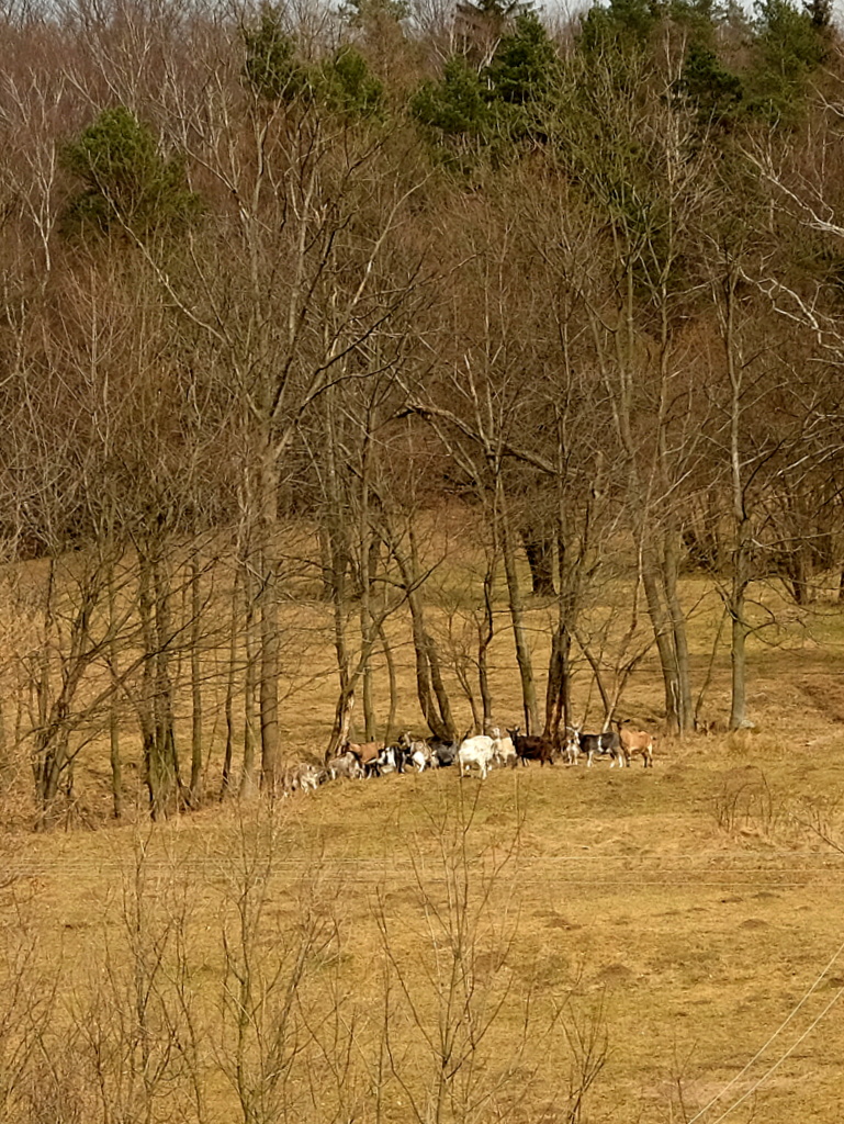Dopiero w okolicach pierwszego, przydrożnego krzyża i nieco powyżej kapliczki znajduje się pierwsze domostwo. Tam też spotykamy najpierw podbiegające do nas dwa psy a potem ich właściciela, który opowiada, że bardzo upodobał sobie to miejsce. Za rozległą polaną i strumykiem na zachodnich stokach Męcińskiej Góry pasie się spore stadko kóz.