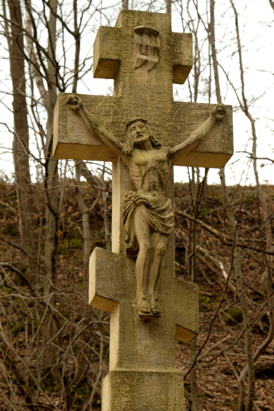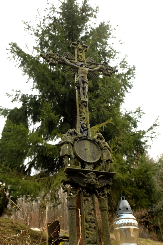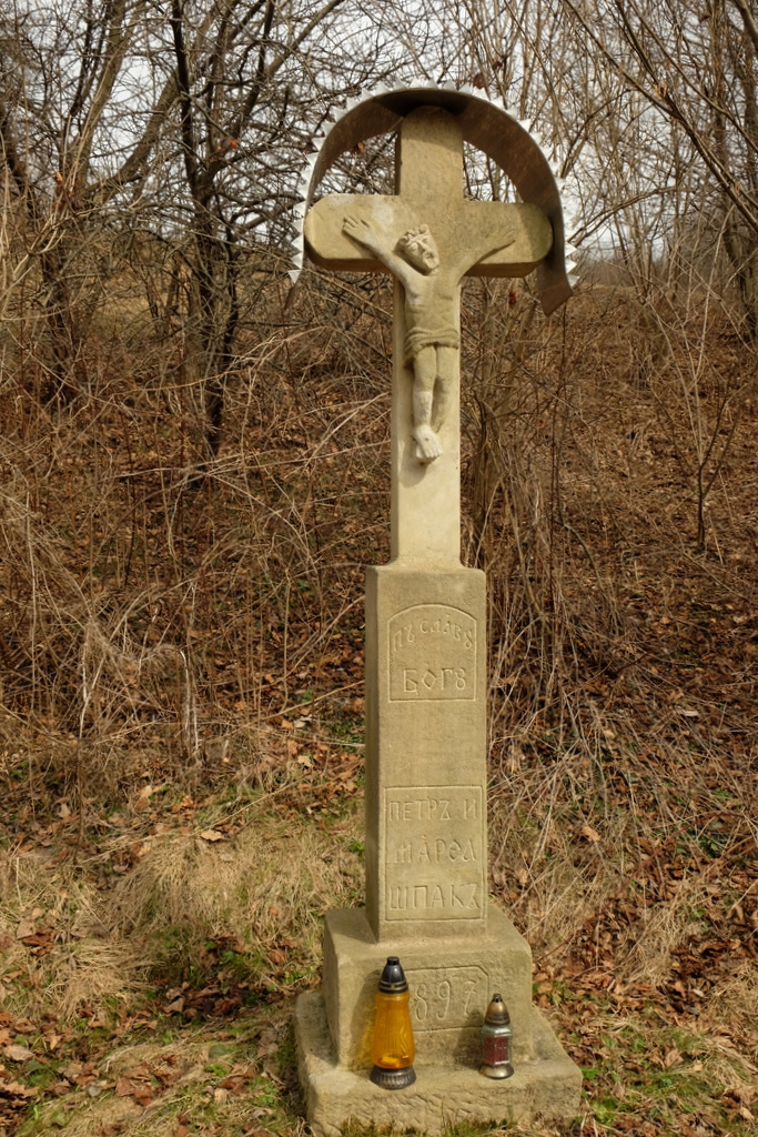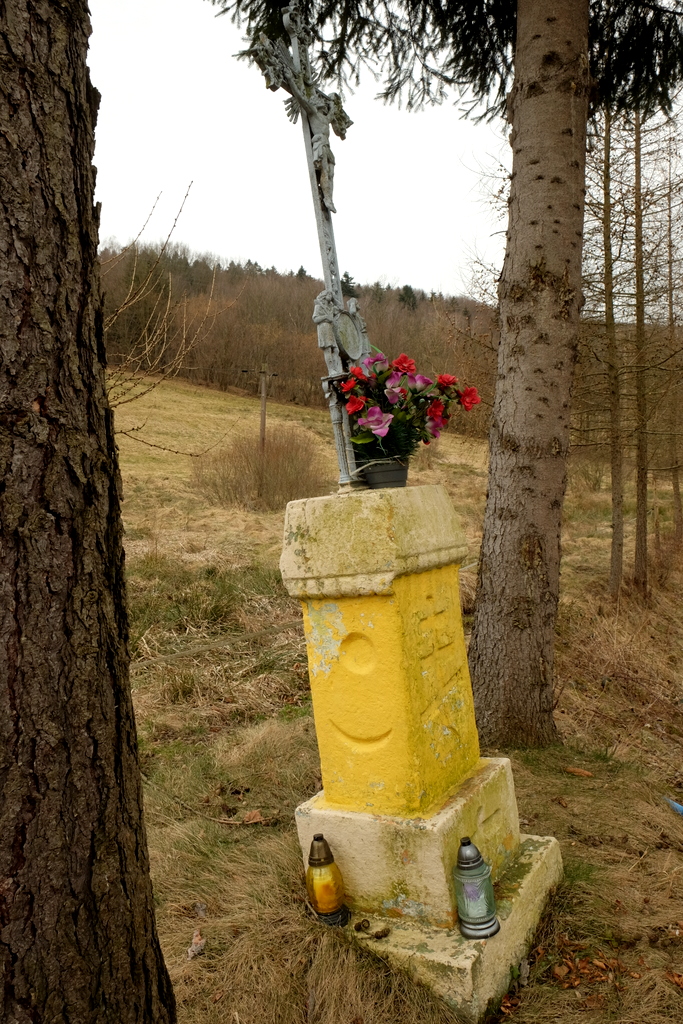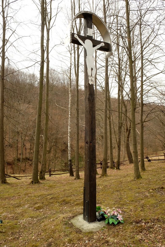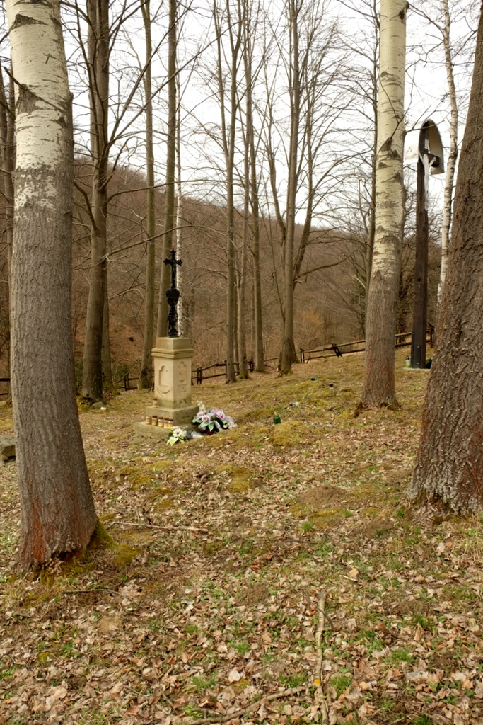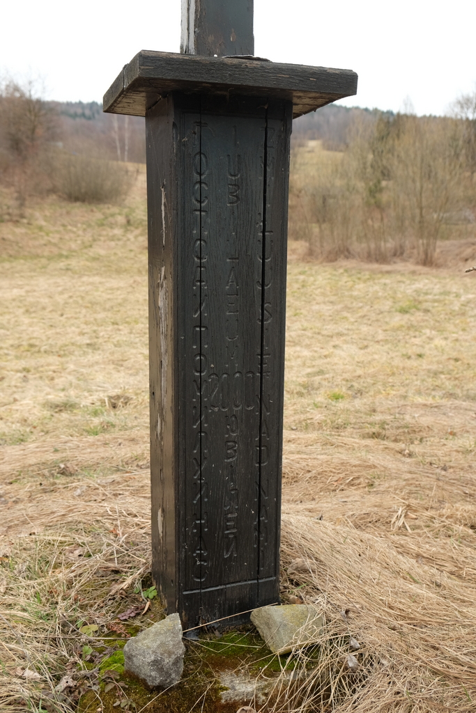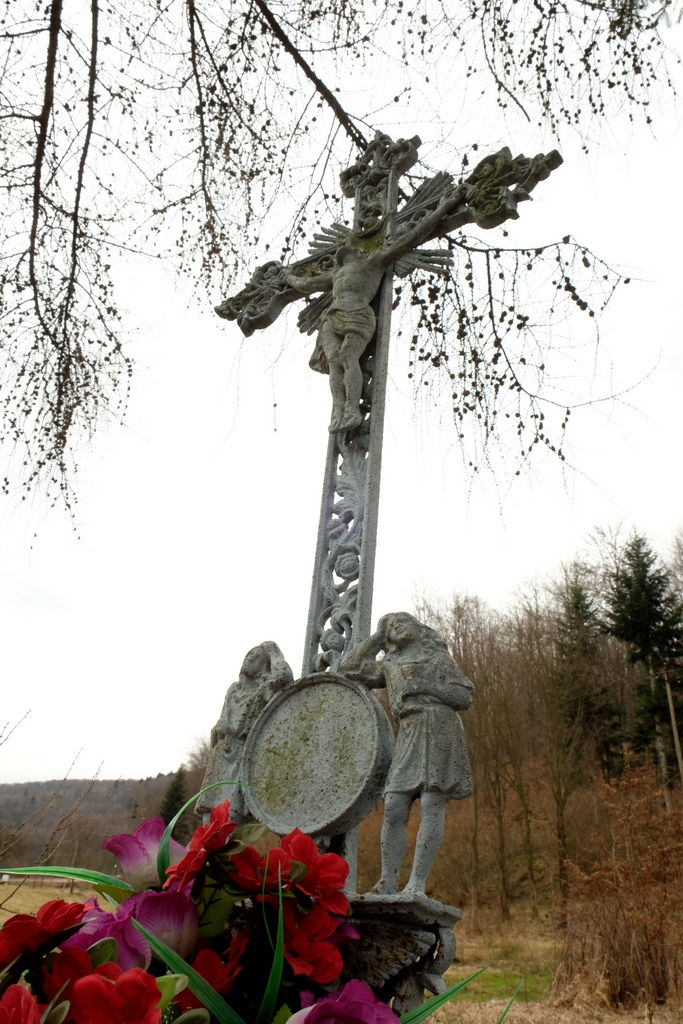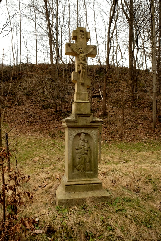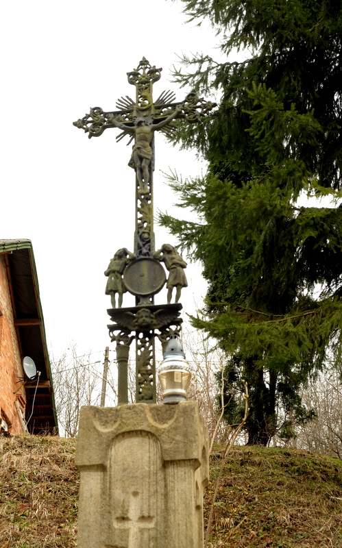 Poniżej, za tym samym strumieniem stoi przydrożny krzyż. Przedzieram się przez chaszcze i strumień powyżej, którego biegnie polna, utwardzona droga. Za nią bardzo ładnie odnowiony krzyż z 1897 roku a na nim inskrypcja sławiąca Boga.