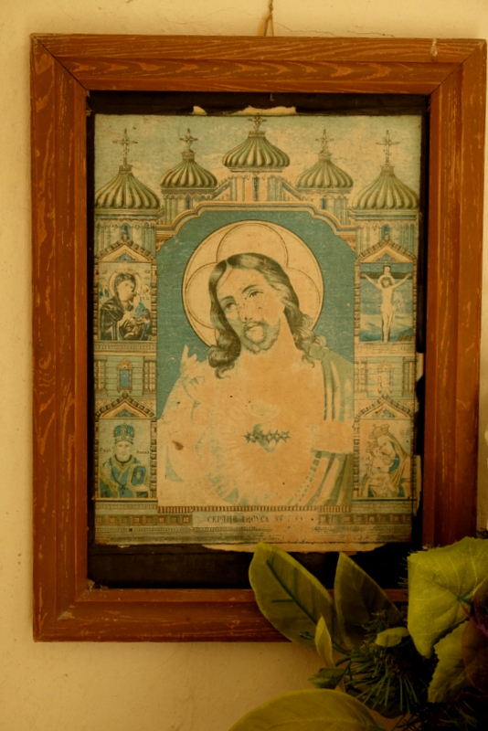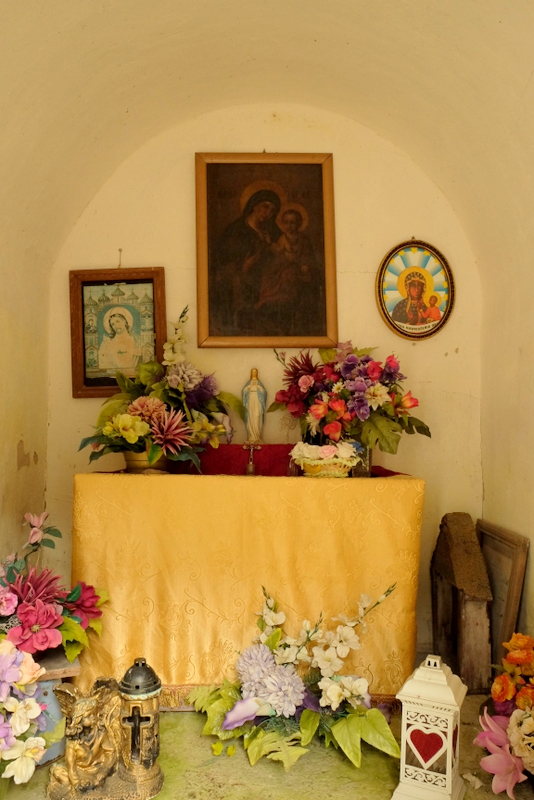 Wewnątrz znajduje się ołtarzyk a nad nim ikona pisana bodajże na drewnianej lub pilśniowej płycie. Po jej bokach wiszą mniejsze obrazy.