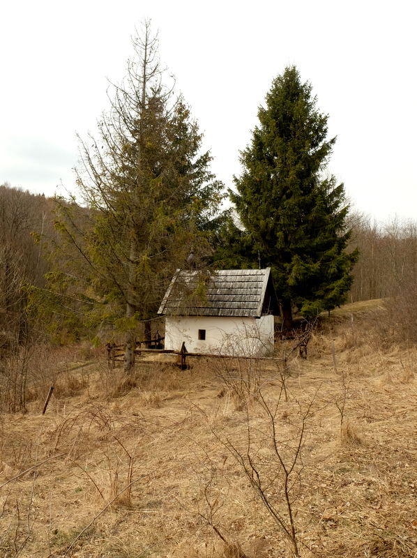 Około 100 metrów niżej droga ta łączy się z tą, którą wcześniej szliśmy. Przy łączeniu się tych dróg stoi murowana z kamienia, otynkowana i pobielona, dość duża kapliczka domkowa. Nakryta jest gontowym dachem, zwieńczonym dwoma kutymi krzyżami typu wschodniego. Większy z nich stoi na niewielkiej cebulastej bani.