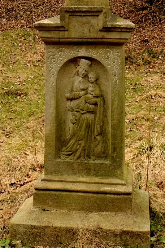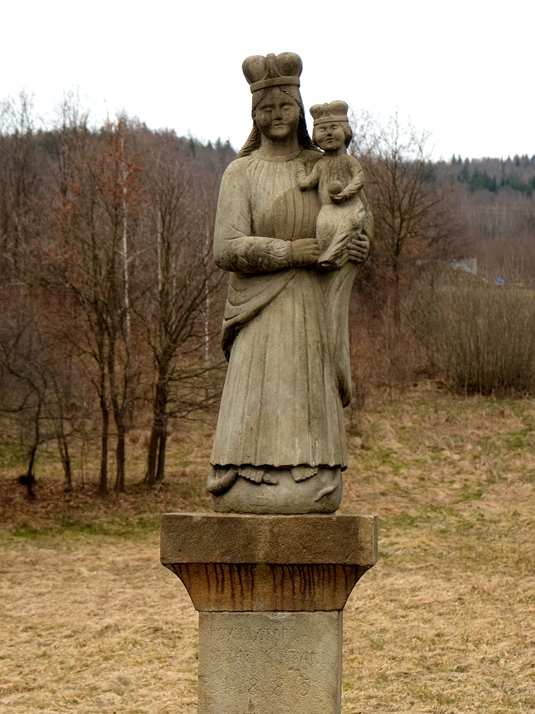 Drugi nieco dalej ale już z prawej strony tej drogi. To bardzo piękny, w całości wykonany z kamienia krzyż, z misternie wyrzeźbioną figurką Chrystusa na krzyżu i pięknym reliefem Matki Boskiej z Dzieciątkiem we wnęce cokołu. Niestety nie ma na nim żadnej daty ani też nikogo w okolicy, kto mógłby udzielić jakichkolwiek informacji o nim.