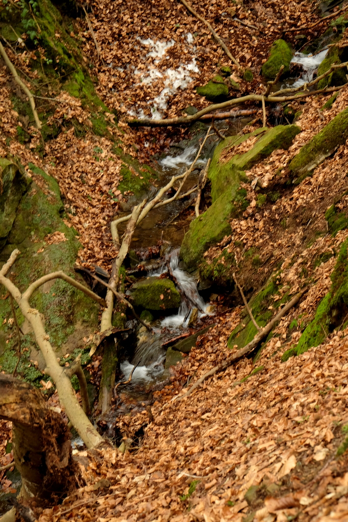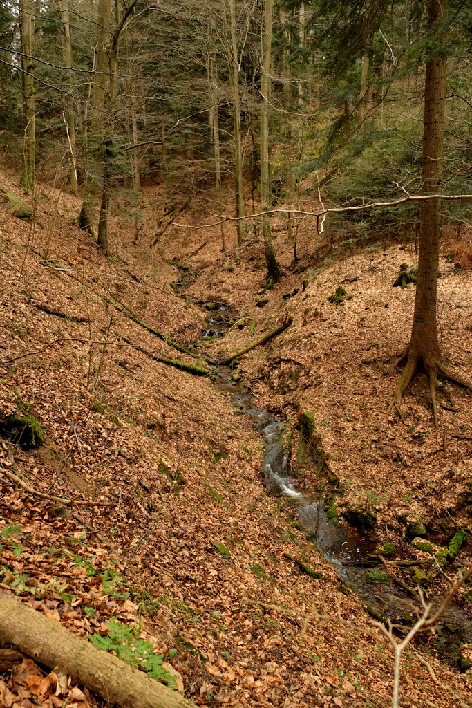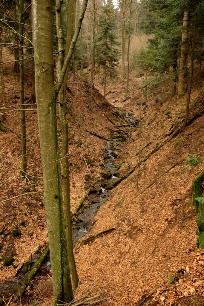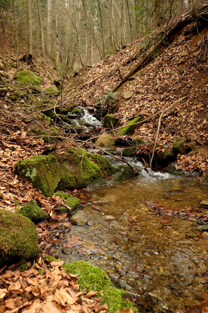 Aby nie wracać tą samą drogą proponuję żeby schodzić w dół strumienia po tej stronie, po której ja jestem. Nie ma tu wprawdzie żadnej drogi ale przejście bukowym lasem nie nastręcza większych trudności – może poza stromiznami.
