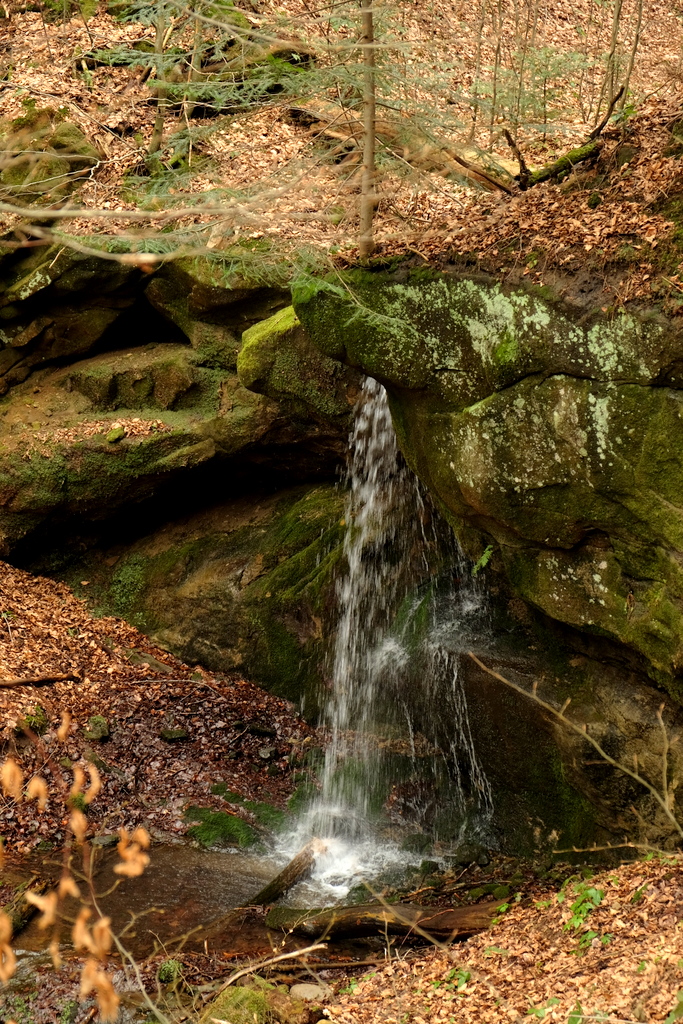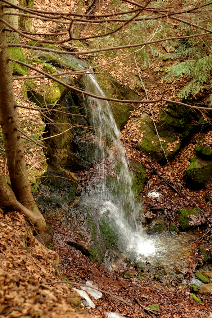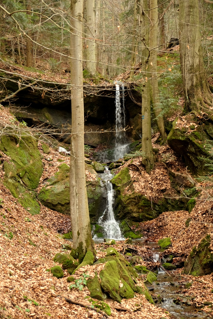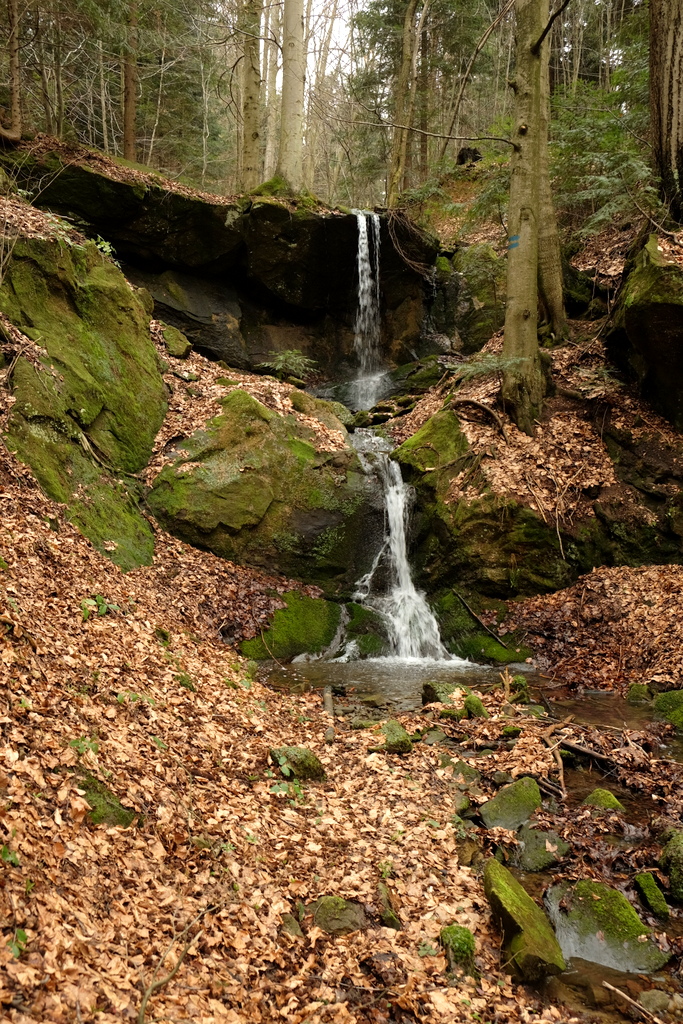 Żeby zobaczyć wodospad trzeba przedrzeć się przez bukowe samosiejki i bardzo ostrożnie – bo jest tu stromo i ślisko – zejść niżej. Najlepiej oprzeć się o pień dużego drzewa i spokojnie wyjąć aparat i robić zdjęcia.