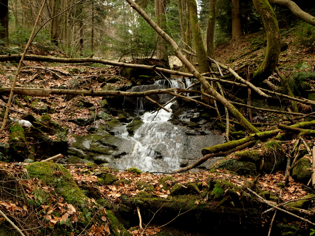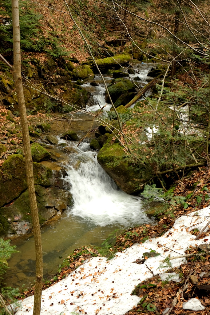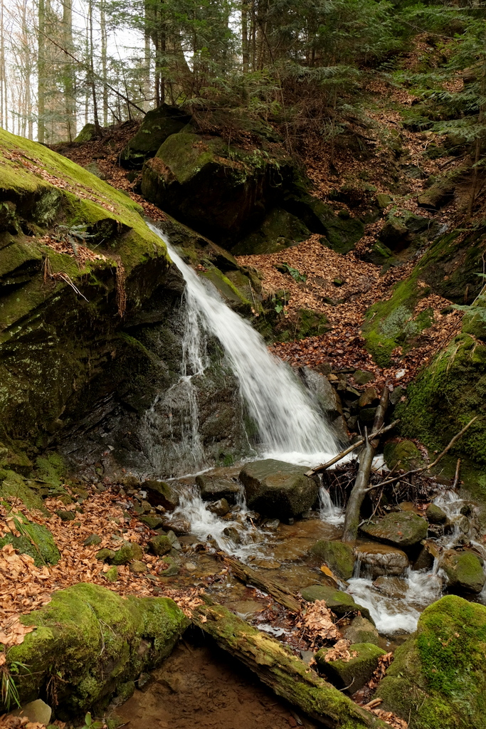 Na bardzo stromym brzegu potoku rośnie sporo młodych, zaledwie kilkuletnich buczków, które same się tu zasiały i przesłaniają widoczność. Zresztą, za nimi jest tak stromo, że dna strumienia nie widać. Idziemy więc dalej nasłuchując szumu spadającej wody. Tam, gdzie staje się on głośniejszy – mamy pewność, że doszliśmy do pierwszego wodospadu. Od drogi znad potoku Wołosiec do tego miejsca będzie jakieś 400 metrów.