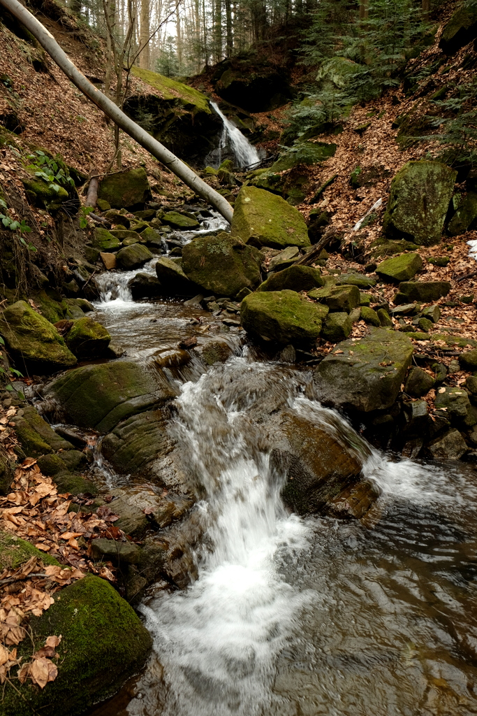 Wychodzę wyżej, mijam dość wysoką kaskadę i wchodzę jeszcze wyżej skąd widzę wysoki dwukondygnacyjny wodospad. Znów ostrożnie szukam dobrych stanowisk, robię kilka zdjęć i widzę, że lepsze stanowiska byłyby po drugiej stronie potoku. Schodzę więc niżej i przeskakuję potok w dogodnym miejscu aby po drugiej stronie znaleźć korzystne miejsca. Znajduję kilka takich i robię zdjęcia.