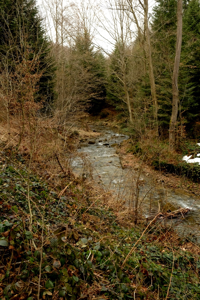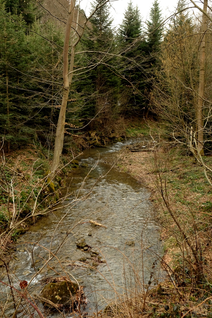 Dopiero ostatnie 100 metrów staje się trudne do przejścia bo rośnie tu mnóstwo młodych jodeł. Omijamy je więc schodząc w jar, gdzie przechodzimy przez potok na drugą stronę do drogi, którą wcześniej podchodziliśmy.