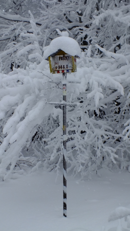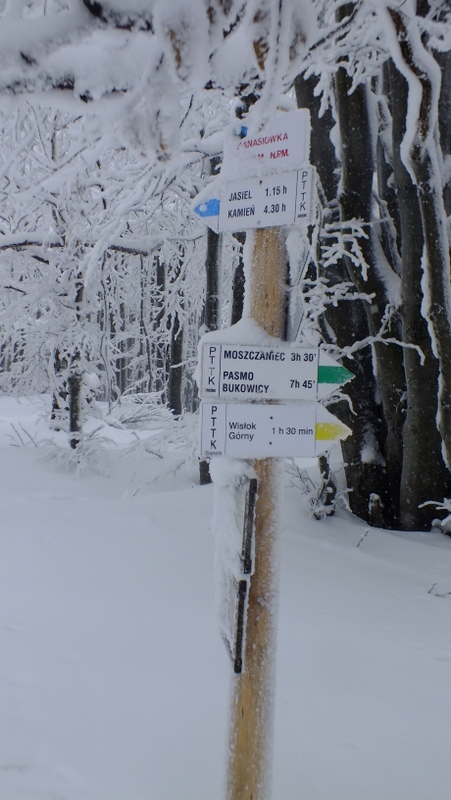 Dopiero w miejscu gdzie odchodzi niebieski szlak do Jasiela zatrzymaliśmy się na chwilę. Jest tu niewielkie miejsce do odpoczynku z kilkoma drewnianymi ławeczekami, oczywiście zasypanymi obecnie śmiegiem.