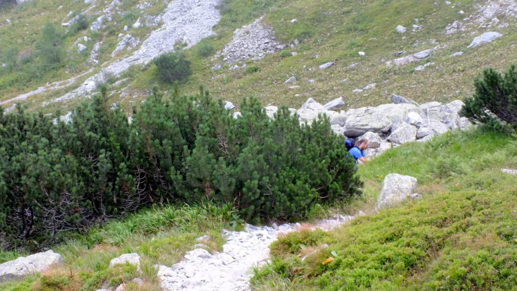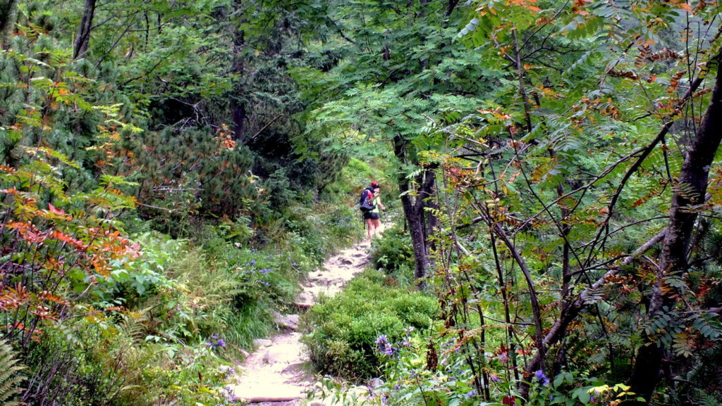 Od węzła szlaków przy budynku wyruszamy do Smutnej Doliny. Początkowo przez las reglowy, a później wśród kosodrzewiny, przyjemną ścieżką znakowaną na niebiesko, zaczynamy podchodzić w górę. Przy kolejnym rozgałęzieniu szlaków na wys. 1522 m n.p.m. odchodzi zielony szlak edukacyjny do Rohackich stawów. Jest tu też miejsce biwakowe, z którego korzystamy żeby się troszkę posilić. Jesteśmy już poza górną granicą lasu, rosną tu kosodrzewiny, pojedyncze jarzębiny i okazałe o tej porze roku ciemiężyce zielone.