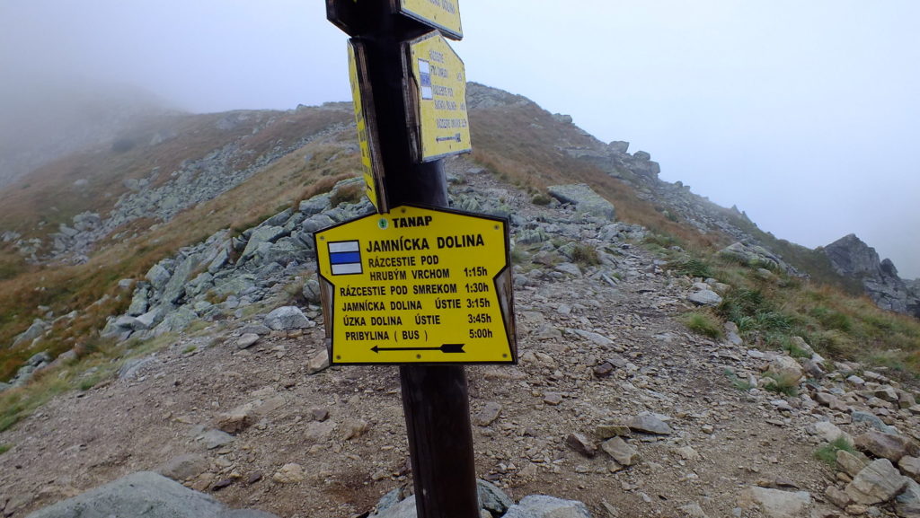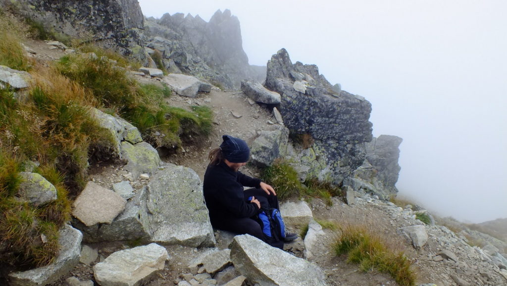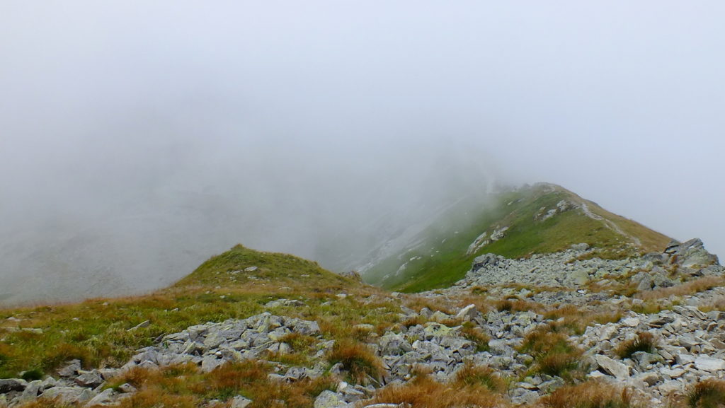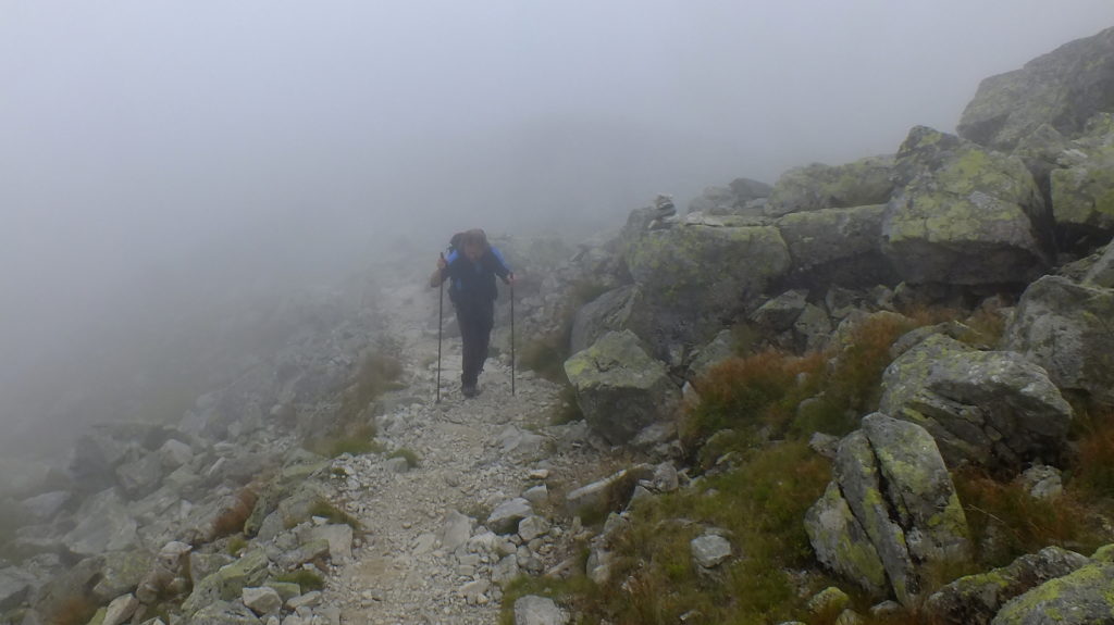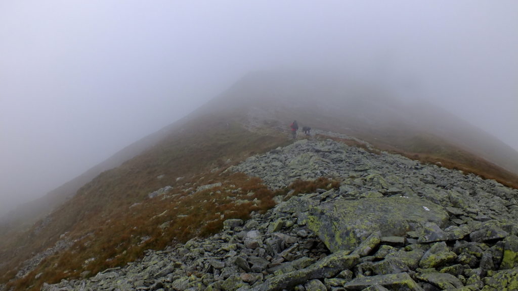 Rozpoczynamy strome podejście na Smutną Przełęcz. Im wyżej tym więcej gruzu skalnego i piargów. Zaczynają też pojawiać się chmury i widzialność drastycznie spada. Robi się też coraz chłodniej. Docieramy w końcu na Smutną Przełęcz (Smutné sedlo), gdzie skrzyżowanie szlaków: niebieskiego z czerwonym. Warto teraz ubrać coś na siebie i napić się gorącej herbaty. Od tego miejsca zaczyna się najbardziej ekscytujący odcinek dzisiejszego szlaku – grań Rohaczy.