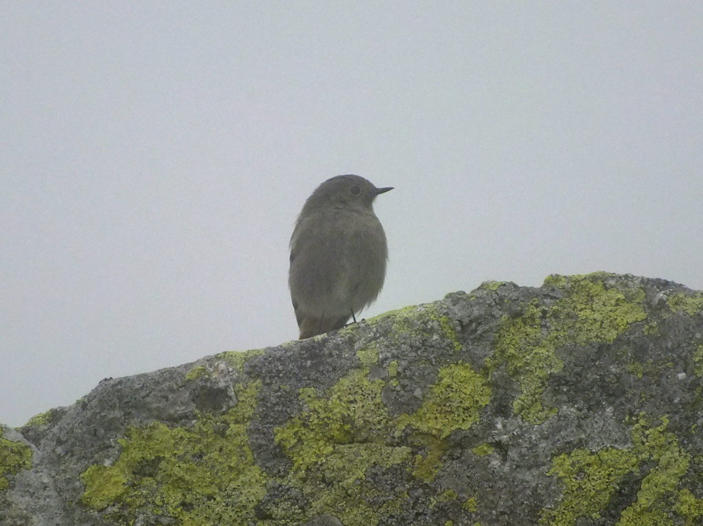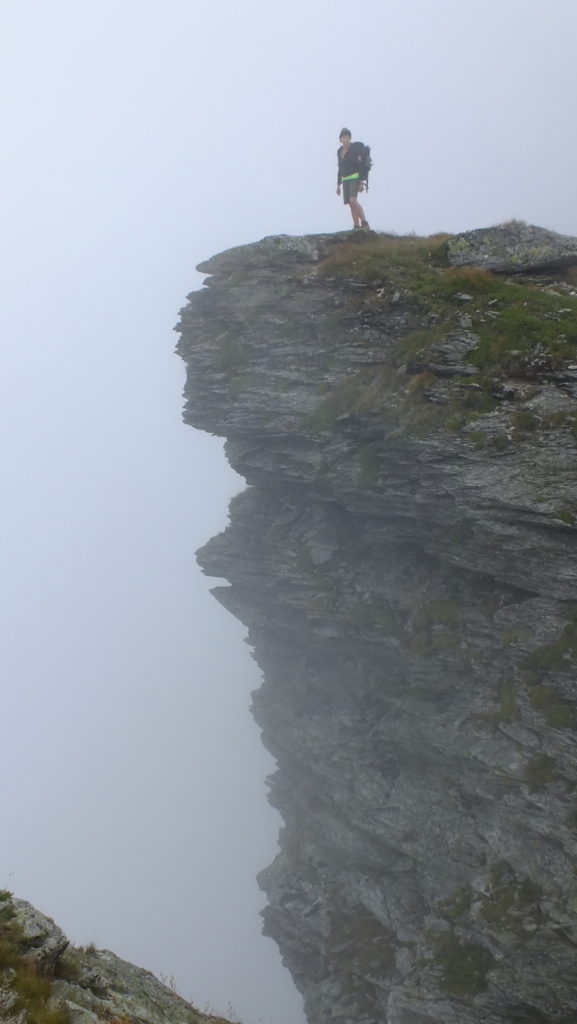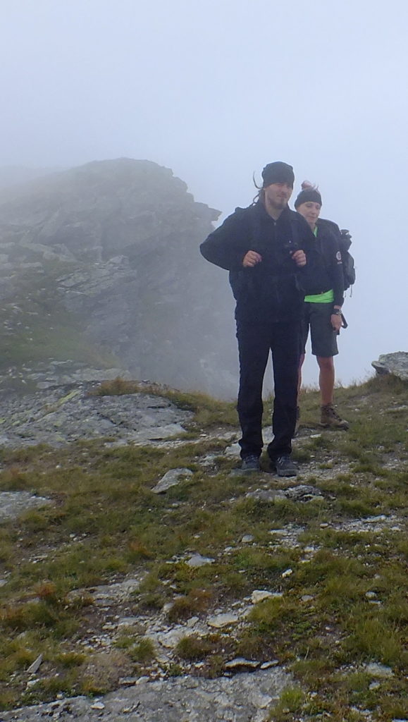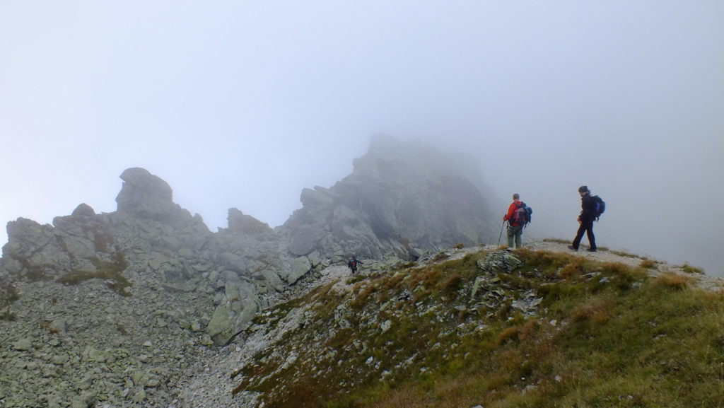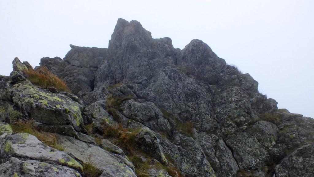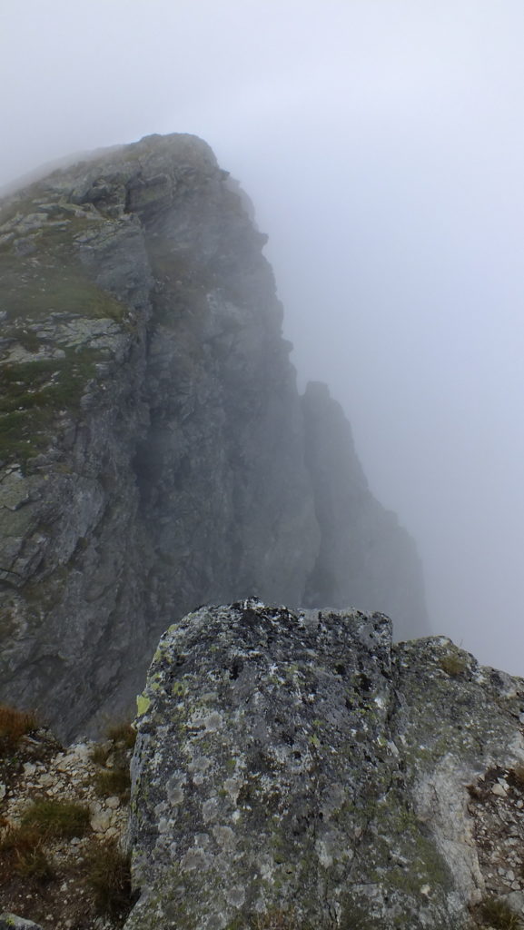 Na wierzchołku chwilę odpoczywamy, nie długo jednak bo znów chmury przysłaniają widoki. Wkrótce zaczynamy zejście pokonując wąską, skalną, postrzępioną grań przywodzącą na myśl skalną płetwę okonia. To chyba najtrudniejsze zejście dzisiaj.