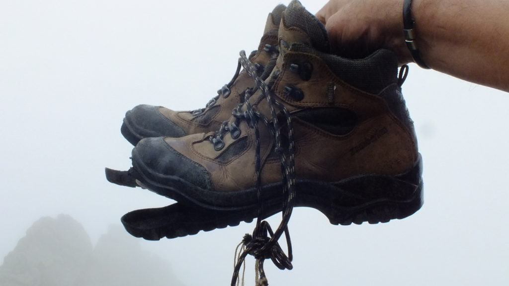 Przy szlaku obok kamiennego głazu znajdujemy mocno zużyte buty trekingowe, ktoś nie raczył ich zabrać ze sobą – brak słów! Są to Zamberlany z odklejonymi podeszwami. Bardzo nieładnie (delikatnie mówiąc) świadczą one o ich właścicielu…