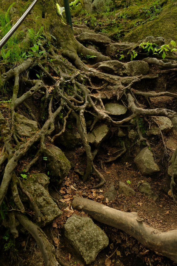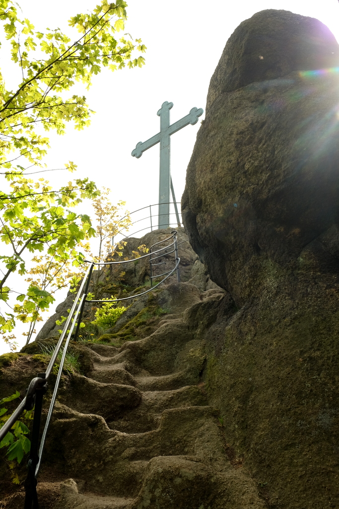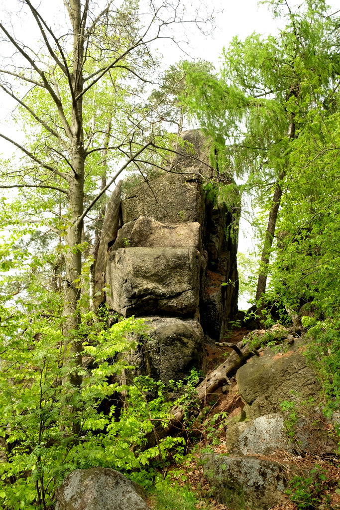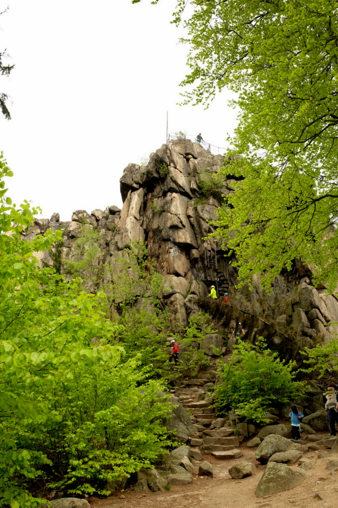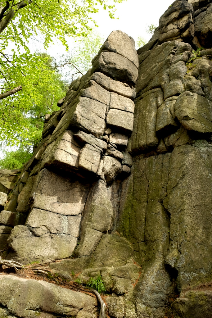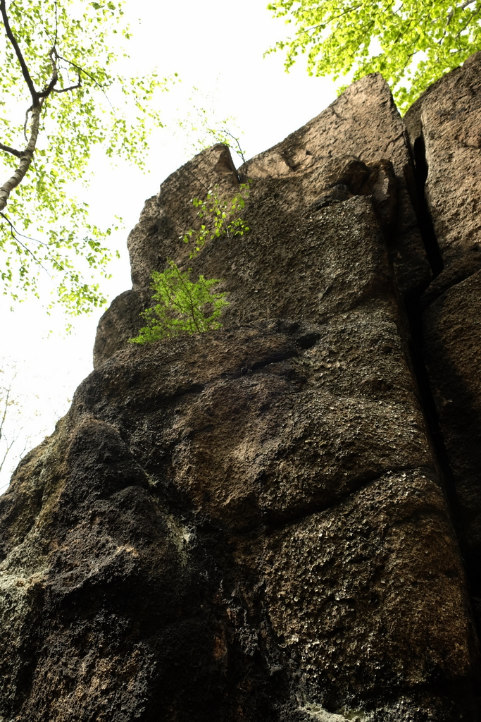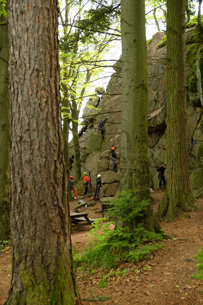 Ścieżka dość stromo wprowadza na wierzchowinę góry, na której znajdują się grupy potężnych skał granitowych. Na tych największych kilku wspinaczy działa już w ścianach. Dwie inne grupy u podnóża skał przygotowują się do wspinaczki. To miejsce jest wśród wspinaczy bardzo popularne i w sezonie prawie codziennie skały są przez nich oblegane.