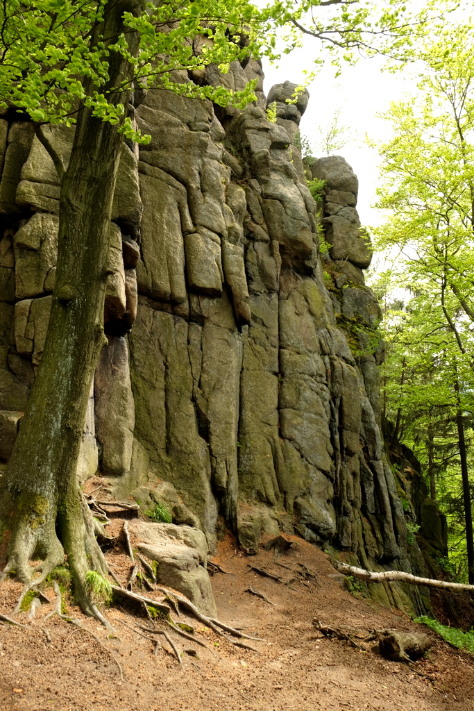 Niniejszy wpis jest kontynuacją relacji z wędrówki przez północne rejony sudeckiego pasma górskiego – Rudaw Janowickich. Przypomnę, że wędrówkę tą rozpoczęliśmy w Janowicach Wielkich skąd poszliśmy w górę doliny Janówki aby stamtąd wspiąć się do ruin zamku Bolczów, umiejscowionych na stoku Suchej Góry. Później wspięliśmy się na Lwią Górę mijając po drodze ciekawe w swoich kształtach skały i grupy skalne (m.in. Skalny Most i Piec). W szczytowych partiach Lwiej Góry penetrowaliśmy labirynty skalne i wspinaliśmy się na rozrzucone po szczycie formacje skalne Starościńskich Skał. Później zeszliśmy na przełęcz Karpnicką skąd udaliśmy się do schroniska PTTK „Szwajcarka”. Schronisko to – jako dobry punkt na krótki odpoczynek – okazało się naturalnym miejscem, gdzie przerwanie relacji z wędrówki byłoby najlogiczniejsze. Tak więc zrobiłem – dzieląc relację z tej wędrówki na dwie części.