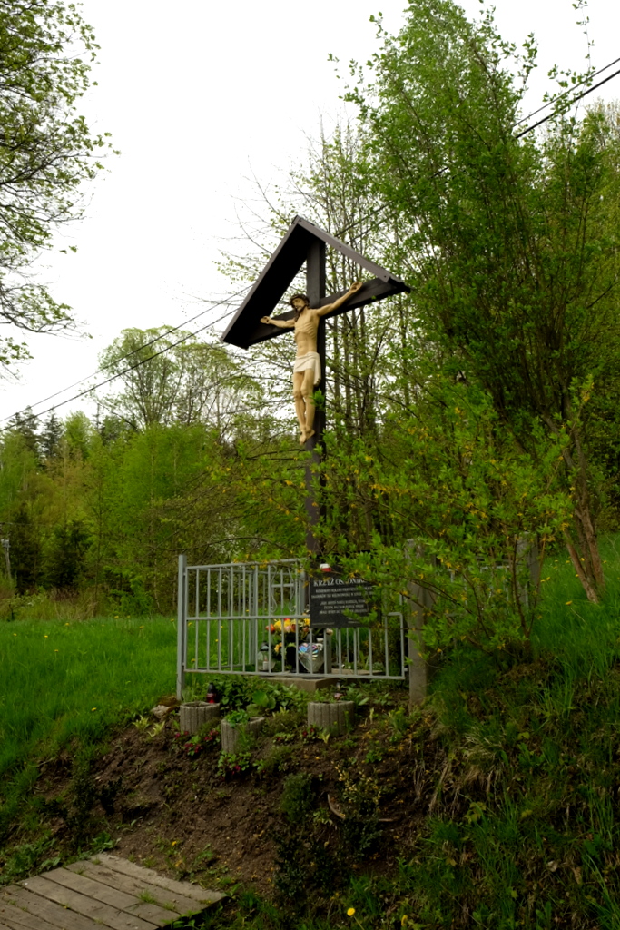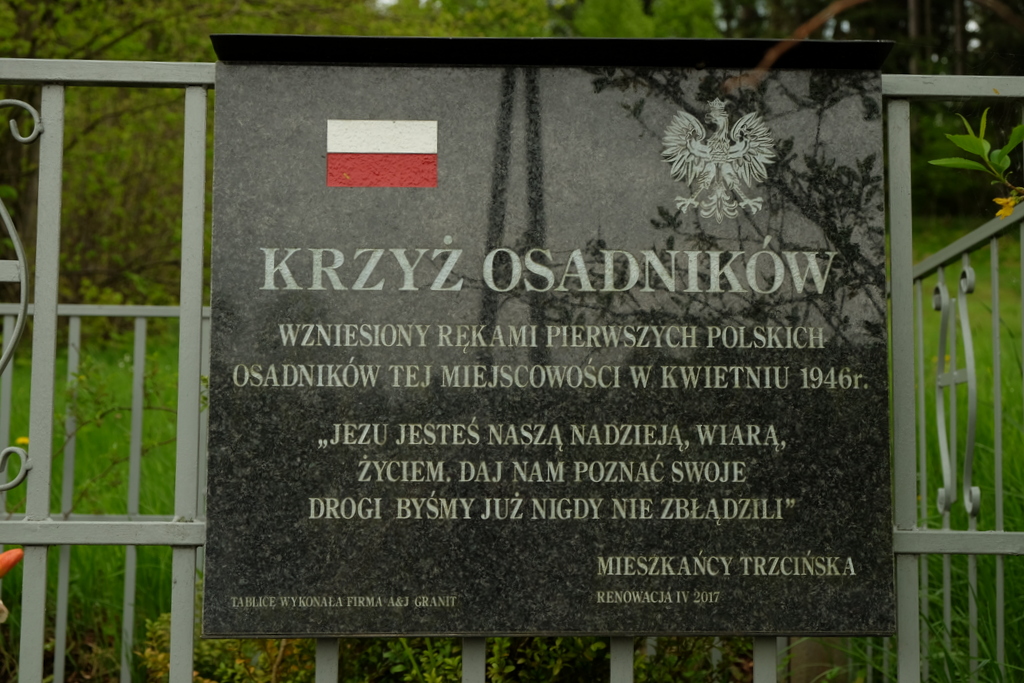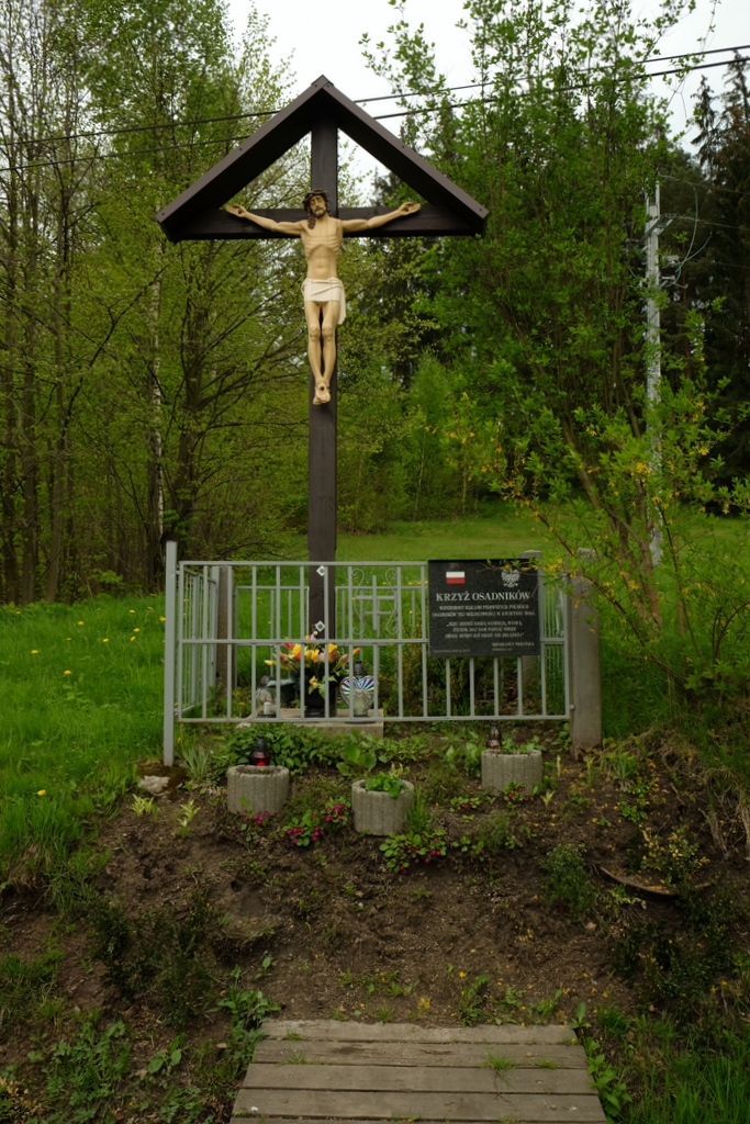 Przy drodze, po jej prawej stronie mijamy samotny krzyż. Zatrzymujemy się przy nim na chwilę – tu okazuje się, że został on wystawiony przez pierwszych, powojennych osadników, przesiedlonych tutaj zaraz po zakończeniu II wojny światowej z Kresów Wschodnich.