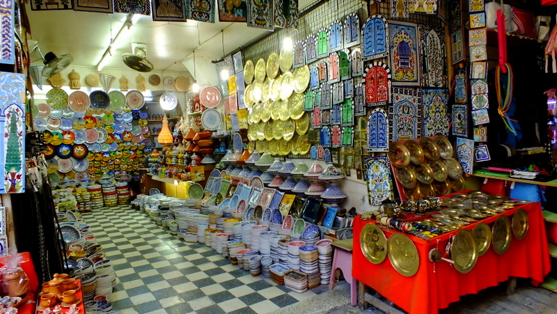 W tych niewielkich sklepikach, po każdej stronie znajdują się tysiące a nawet dziesiątki tysięcy malutkich drobiazgów o podobnej liczbie przeróżnych barw i kształtów. Można znaleźć tu biżuterię, naczynia, chusty, ubrania, buty, malowidła, kadzidełka, dywany, pamiątki i wiele innych przedmiotów codziennego użytku. Pełno tu również również artykułów spożywczych, owoców i warzyw w sąsiedztwie przypraw, których woń unosi się na każdym kroku. W tym miejscu również nie odczujemy głodu ani pragnienia. Bez problemu można zjeść wiele lokalnych dań, które są dla nas zupełnie egzotyczne. Można też zjeść coś podobnego do znanej nam tortilli czy kebabu.