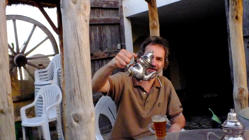 Po tak aktywnie spędzonym dniu udaliśmy się do kawiarni, która mieściła się na dachu jednego z budynków aby tam zakosztować lokalnej herbaty. Mając na myśli herbatę sądziliśmy, że zostanie podana nam taka zwyczajna herbata. W Tunezji jednak herbata podawana jest z dużą ilością mięty i cukru. Kelner najczęściej podaje ją w małych metalowych czajniczkach aby dłużej utrzymała wysoką temperaturę. Tylko mistrzowie są w stanie przelać ją z czajniczka do szklanki z wysokości kilkudziesięciu centymetrów i nie uronić ani jednej kropli. Takim mistrzem przelewania okazał się być mój tato 🙂 .