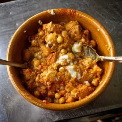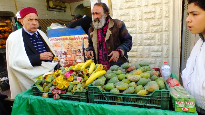 Później skosztowaliśmy potrawkę z tuńczyka wraz z warzywami przygotowaną na oliwie z oliwek, którą je się rękoma nabierając porcję połamaną bagietką. Na sam koniec skosztowaliśmy dania jak poprzednio tylko że zamiast tuńczyka serwowany był kurczak. Kupiliśmy też owoce opuncji.
