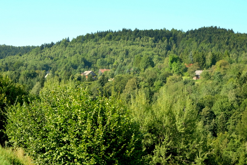 Przed niewielkim wzniesieniem kończą się zabudowania. Po przeciwnej stronie tego wzniesienia zaczynają się zabudowania niewielkiego przysiółka zwanego Budy. Niewiele tutaj domów więc szybko go mijamy po czym wznoszącą się drogą wchodzimy w las.