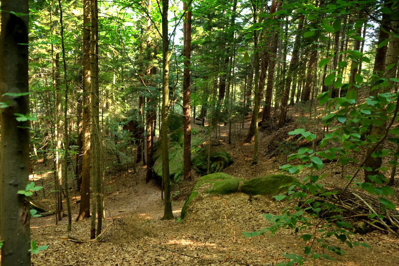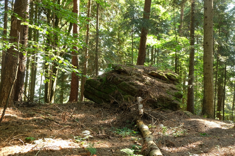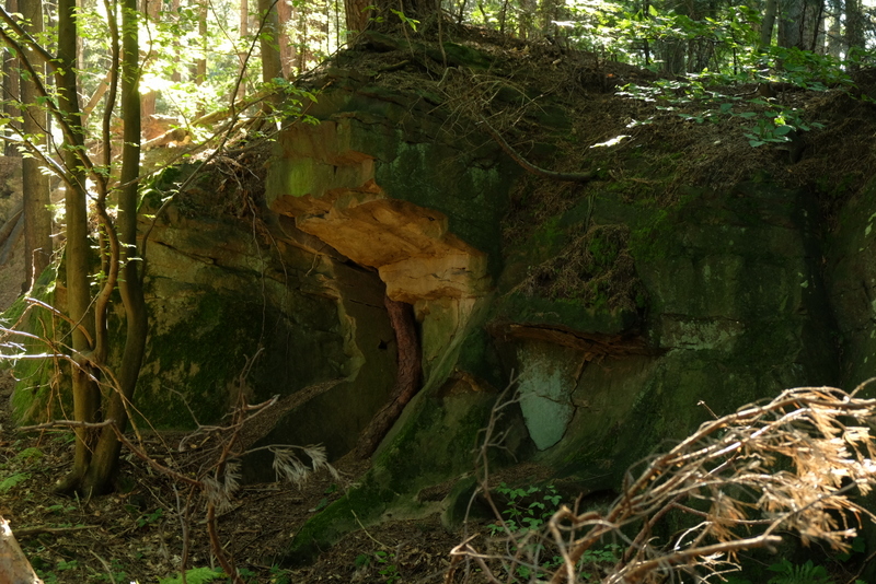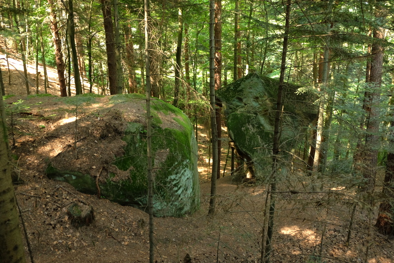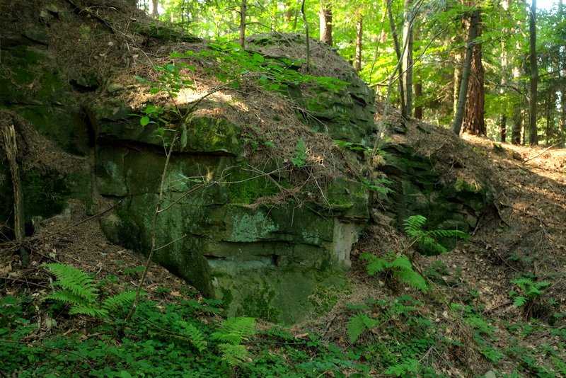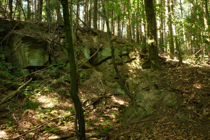Po powrocie do drogi, przechodzimy na jej drugą stronę i tam kierujemy się w widoczną, leśną dróżkę. Prowadzi ona wokół wzniesienie zwanego Działem Trzecim. Wchodzimy na kulminację w nadzieji, że i tu zobaczymy jakieś skały bo takowe zaznaczone są na mapie. Jakieś są ale wyglądają nieciekawie. Wyczytałem gdzieś jakiś czas temu, że do przełomu lat 50-tych i 60-tych XX wieku było tu kilka pięknych ostańców skalnych. Niestety, eksploatowane przez miejscowych nie przetrwały w takiej formie do dzisiejszych czasów.
