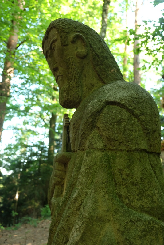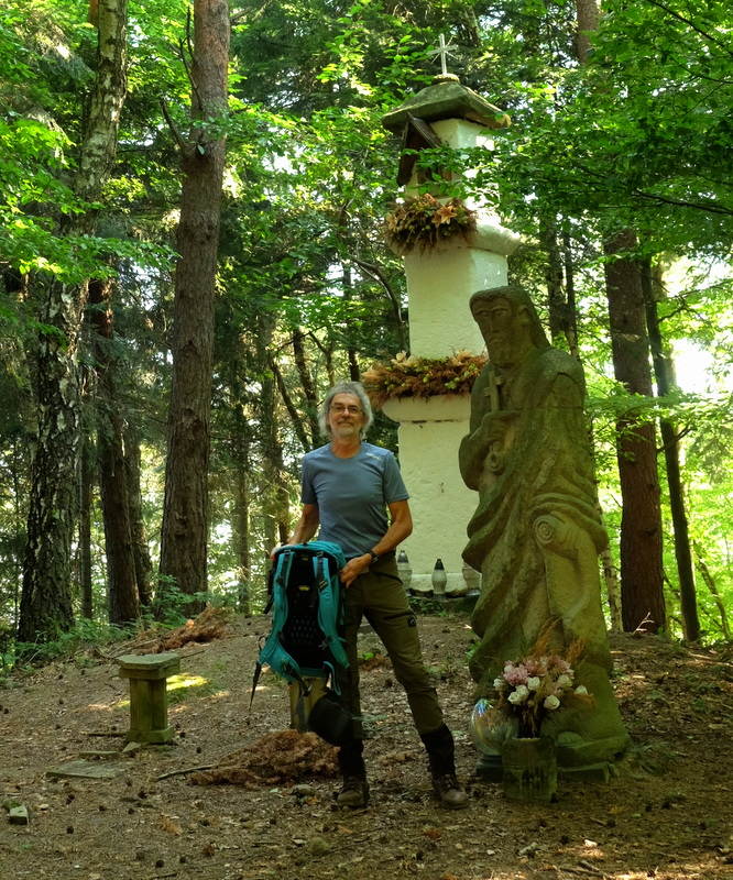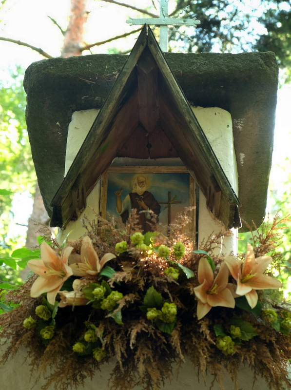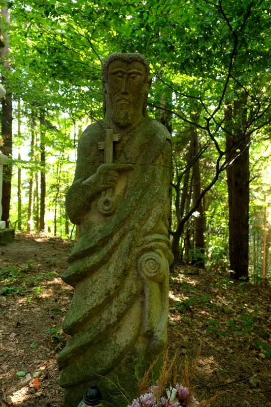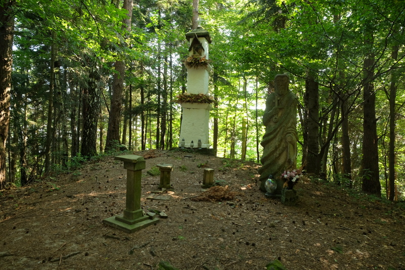 Stąd już bardzo blisko do kulminacji wąskiego grzbietu, na której stoi wysoka kamienna kapliczka.