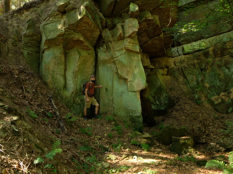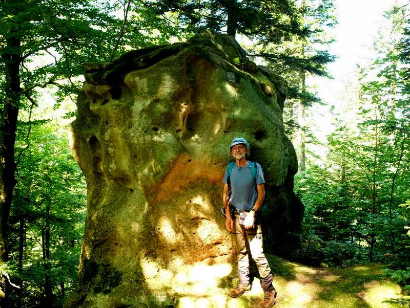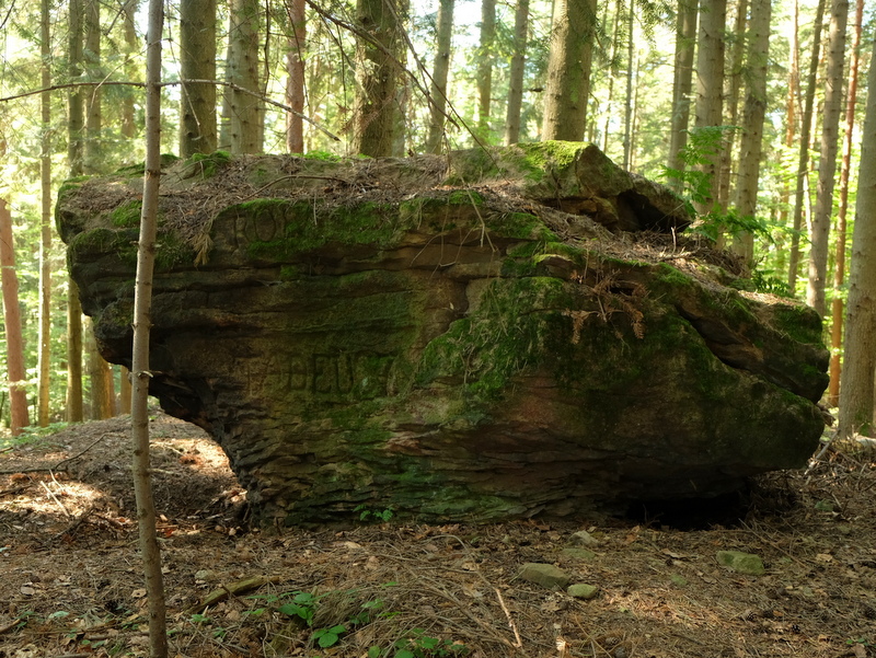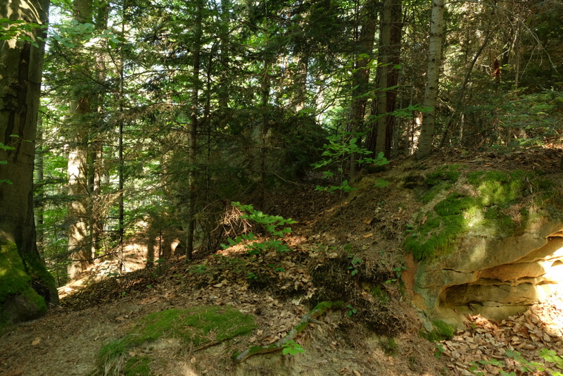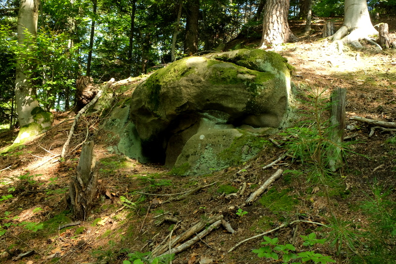 W niedalekiej odległości od góry Połom znajdują się ukryte w pogórzańskich lasach ciekawe w swoich kształtach ostańce skalne. Niektóre z nich mają status pomników przyrody nieożywionej. Sam bardzo lubię takie skały dla siebie odkrywać – o czym też zaglądający do bloga nieraz się przekonują. Te skały to m.in. Konfederatka, zwana też Niedźwiedzicą i Maczuga. Zaproponowałem więc Kamilowi aby tak zmodyfikować trasę wędrówki żeby przy okazji te skały odwiedzić.