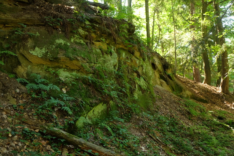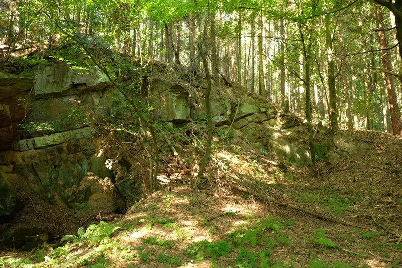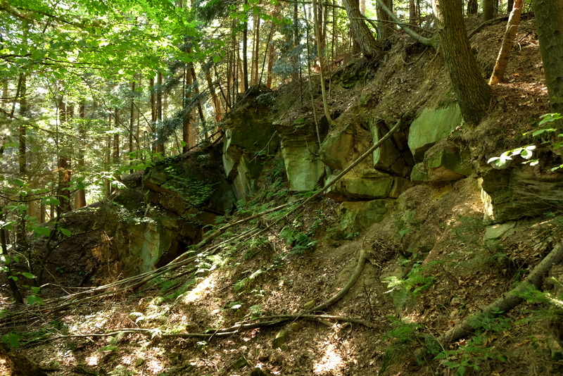 Po minięciu rozległej polany wchodzimy w drogę leśną w dalszym ciągu podchodząc na grzbiet Połomi. Wkrótce osiągamy urwisko skalne – właściwie należałoby powiedzieć – wyrobisko, gdyż dawniej pobierano stąd twardy piaskowiec odłupując go od macierzystej skały.