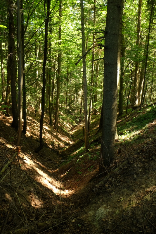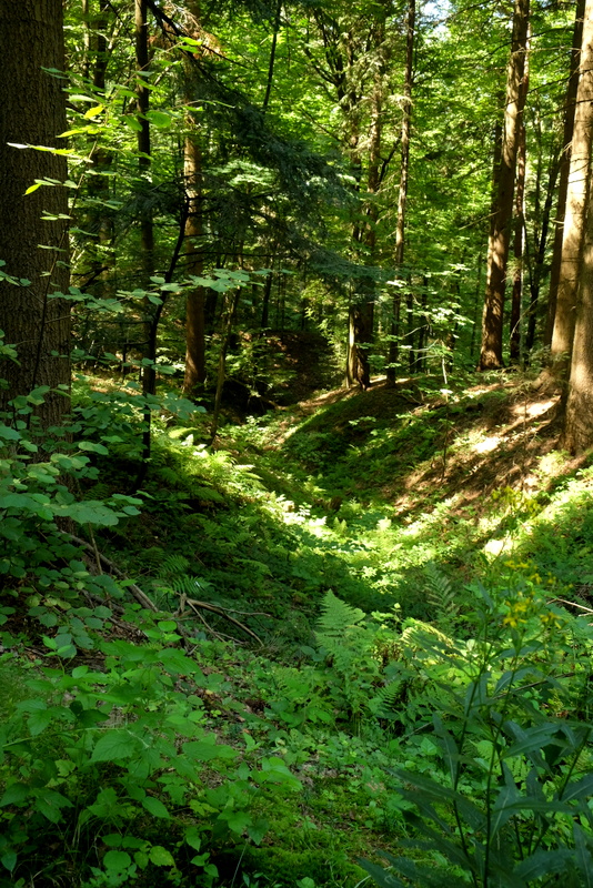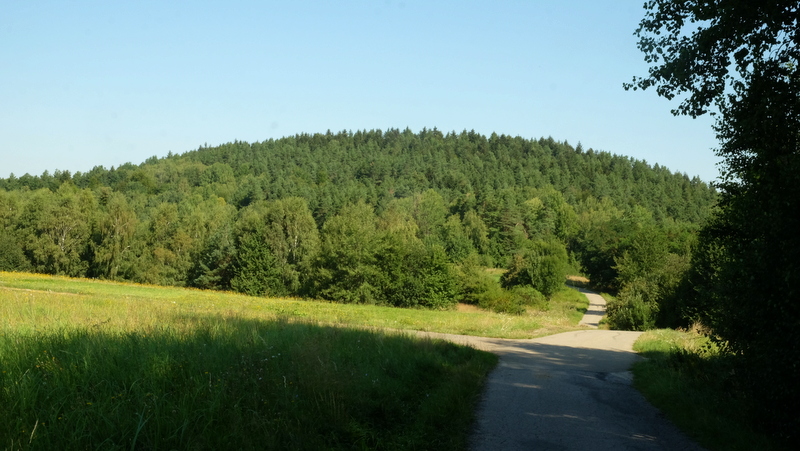 Leśna droga prowadzi nas na południe omijając kulminację od strony zachodniej. Wędrówkę kontynuujemy w kierunku ogólnym południowym. W pewnym momencie droga skręca w prawo w stronę zachodnią po czym ostrym skrętem zmienia kierunek na północny. Przez jakiś czas idziemy zgodnie z jej przebiegiem mając świadomość, że aby dostać się do Woli Komborskiej musimy przeprawić się przez głęboki i mocno zarośnięty jar potoku.