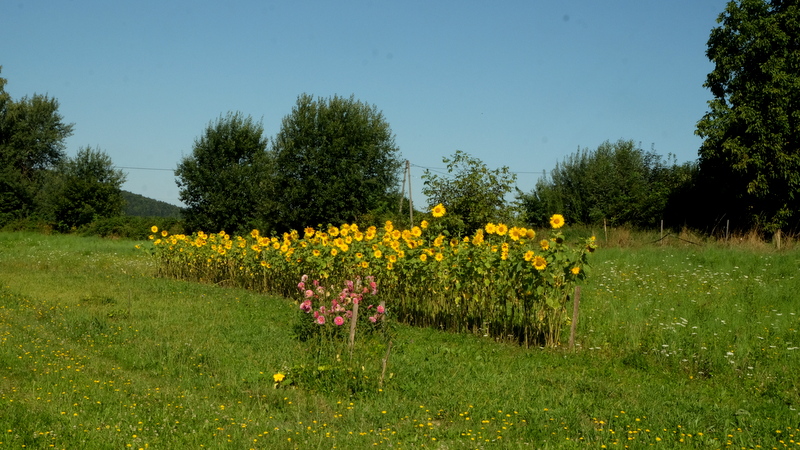 Nieco niżej zaczynają się pierwsze zabudowania integralnej części wsi Wola Komborska zwanej Działy. Mijamy samotne domostwo skąd obszczekuje nas kundelek strzegący swojego terytorium. Idzie też kilkaset metrów za nami szczekając a właściciele jakoś nie są go w stanie uspokoić. W końcu daje za wygraną i odchodzi.