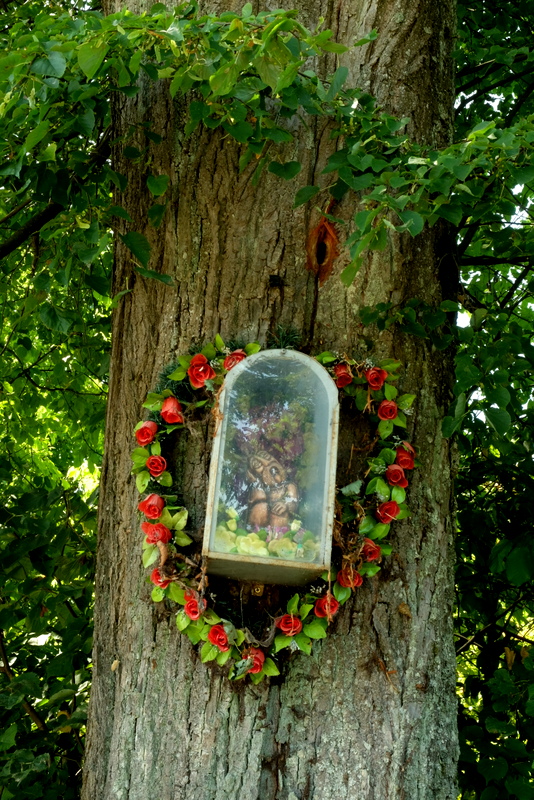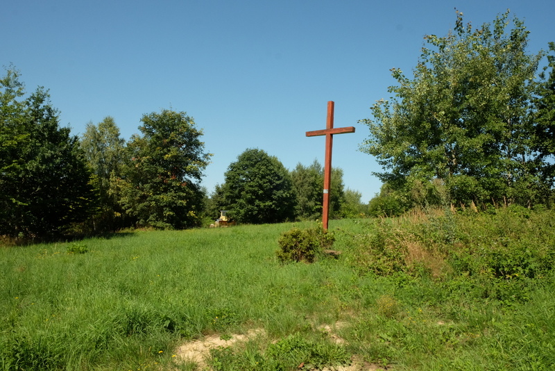 Nieopodal, ale już na prywatnej posesji stoi niewielka, współczesna kapliczka.