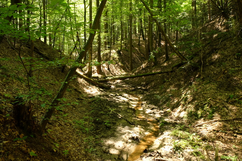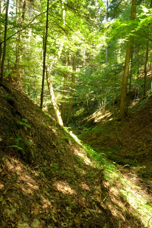 Przeciwny brzeg potoku jest równie stromy a nawet bardziej urozmaicony bo odgałęzia się od niego też głęboki jar niewielkiego strumienia zasilającego ten potok.