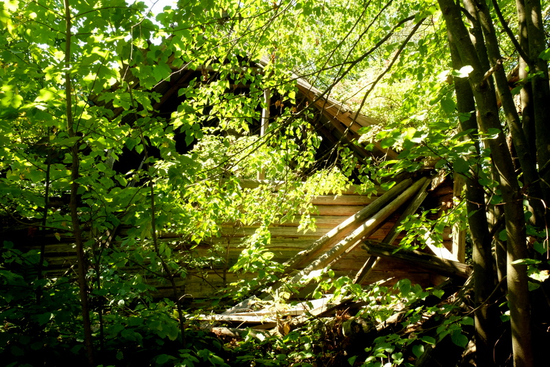 Podeszliśmy więc do niego aby przyjrzeć mu się z bliska. Dom otoczony kiedyś zapewne zadbanym ogródkiem i owocowym sadem, obecnie tak bardzo zaniednany i zarośnięty różnymi krzakami i drzewami, że trudny jest do zauważenia. Niegdyś musiał być bardzo ładny i gdyby nie fakt, że jest on w stanie ruiny to z pewnością mógłby być zabytkim. Niestety opuszczony przez dziesiątki lat prawdopodobnie nie nadaje się już do żadnego remontu. Może jednak gdyby się ktoś uparł – kto wie?