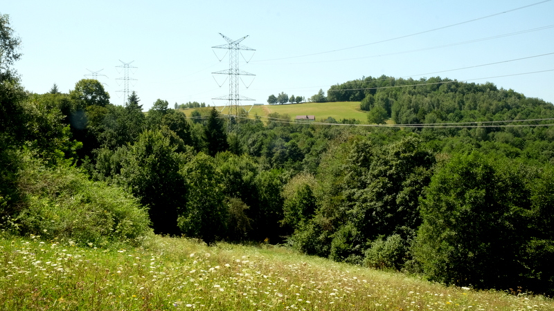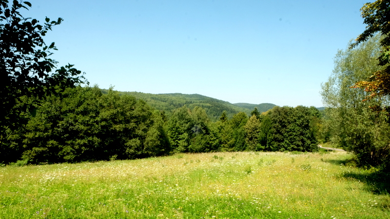Po kilku minutach łagodnego zejścia ze szczytu wychodzimy z lasu na rozległy otwarty teren. Ładne stąd widoki na wschodnie, południowe i zachodnie wzgórza Pogórza Dynowskiego. Na horyzoncie, w kierunku południowym widać pasma Beskidu Niskiego.