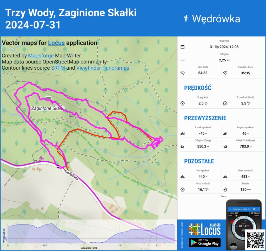 A tak wygląda zapis śladu krótkiego spacerku do wodospadu Trzy Wody i Zaginionych Skałek (ścieżka w różowym kolorze):