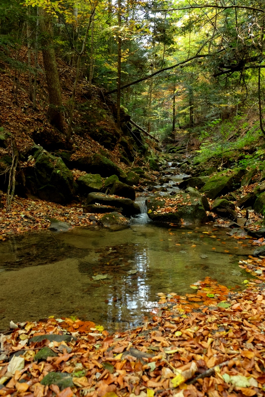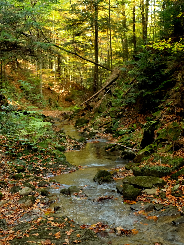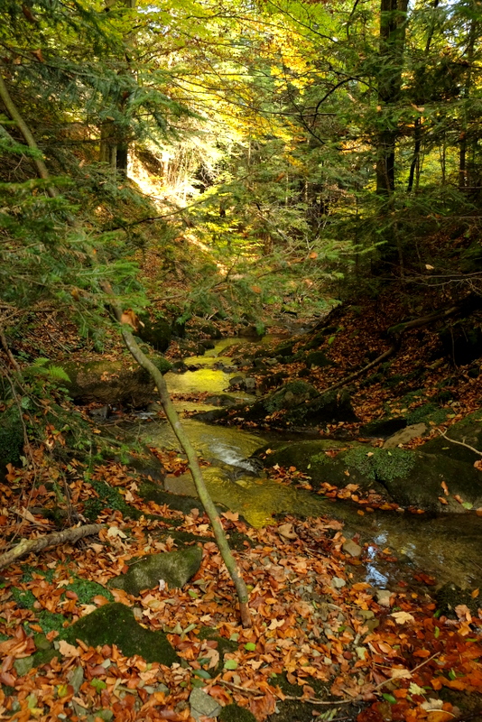 Miejscami Szczawa wcina się głęboko tworząc bardzo stromy jar. Trudno się po takiej stromiźnie poruszać w górę czy w dół więc muszę podchodzić ciągle wzdłuż dna koryta przeskakując z kamienia na kamień. W taki sposób mijam kolejne progi wodne i kaskady. Docieram też do największego z tych niewielkich wodospadów ciesząc swoje oko bo naprawdę prezentują się on tutaj, o tej porze roku (jesień) bardzo ładnie.