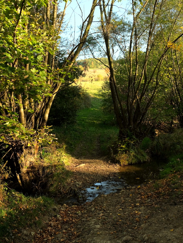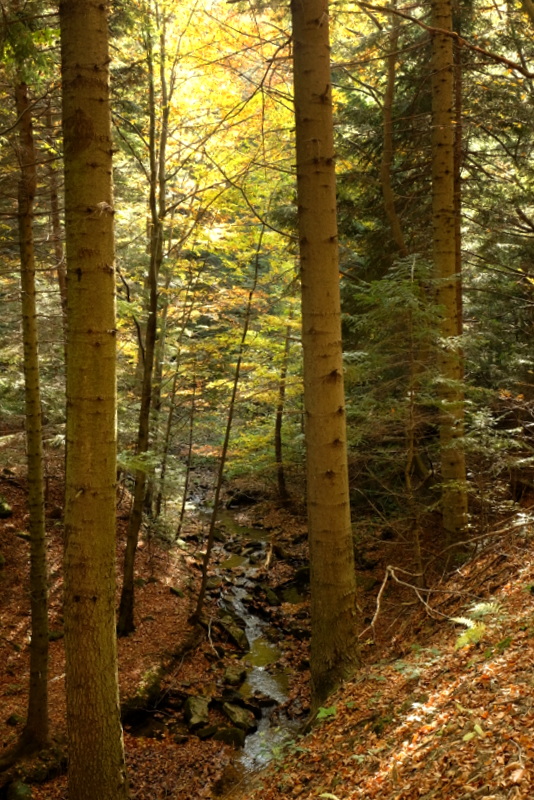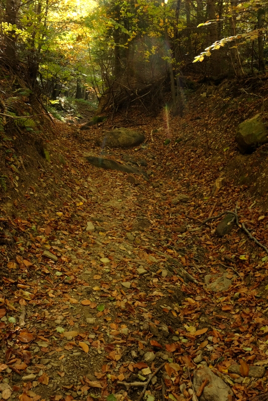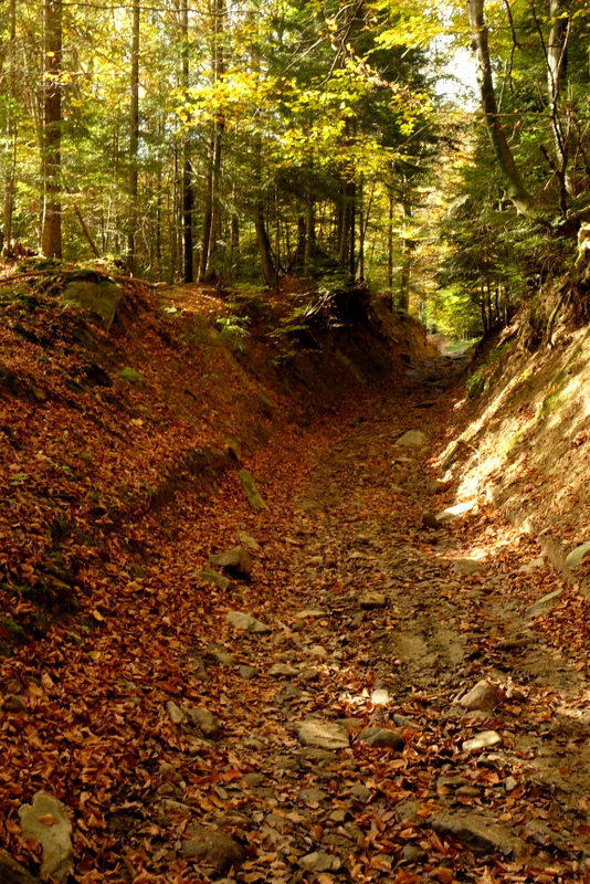Mijam jeden z większych dopływów Szczawy i nieco wyżej, gdy potok staje się coraz węższy wspinam się po stromej skarpie do drogi, którą poprowadzony jest szlak. Miejscami skarpy po obu stronach są na tyle wysokie, że idzie się tędy chwilami jak między ściankami niewielkiego wąwozu.