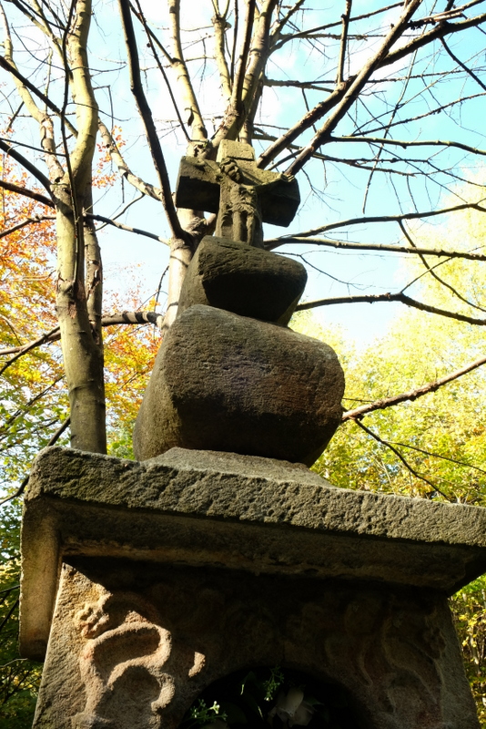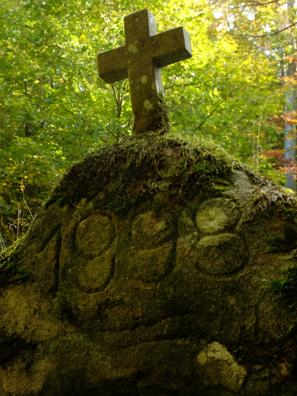 Tu przechodzę na drugą stronę asfaltowej drogi aby następnie podejść do starego, kamiennego krzyża stojącego w szczerym polu. Jest on pęknięty ale zabezpieczony przed zniszczeniem stalowymi kątownikami.