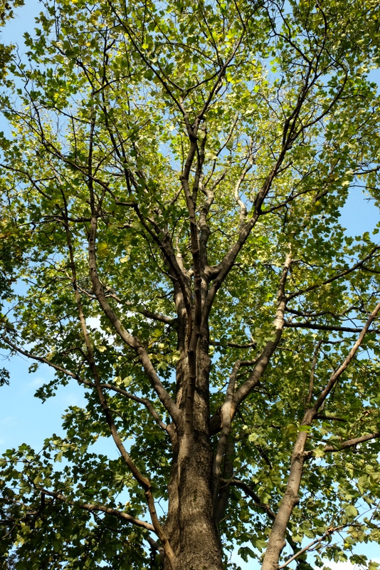 Obok, prawie na samym szczycie, rośnie rozłożysty jawor. Jest połowa października a jego liście są jeszcze całkiem zielone.