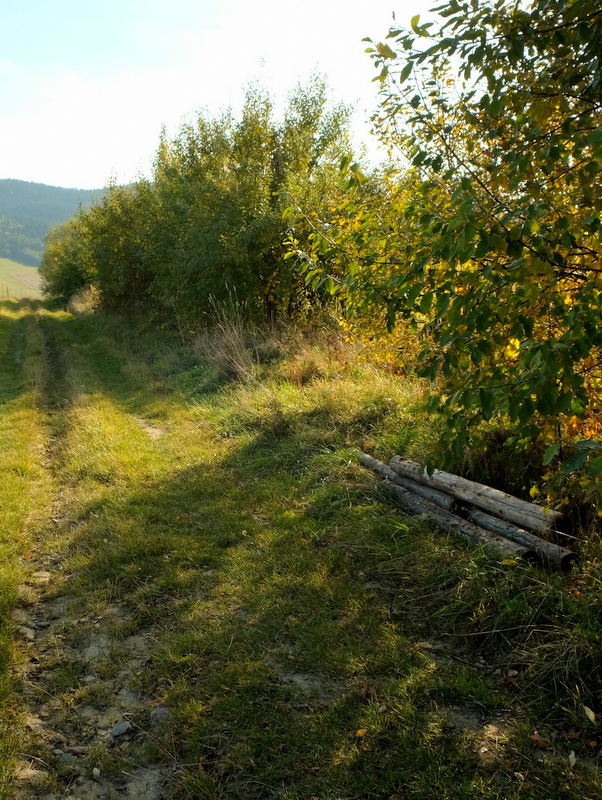 Droga sprowadza do Brzezowej ale nie zamierzam nią zejść do wioski. W dogodnym miejscu przechodzę do równolegle biegnącej drogi łączącej Brzezową z Walikiem i Jaworzem. Tą drogę też zostawiam przedzierając się przez zarośla okalające strumień, który też muszę przekroczyć w możliwym do przejścia miejscu.